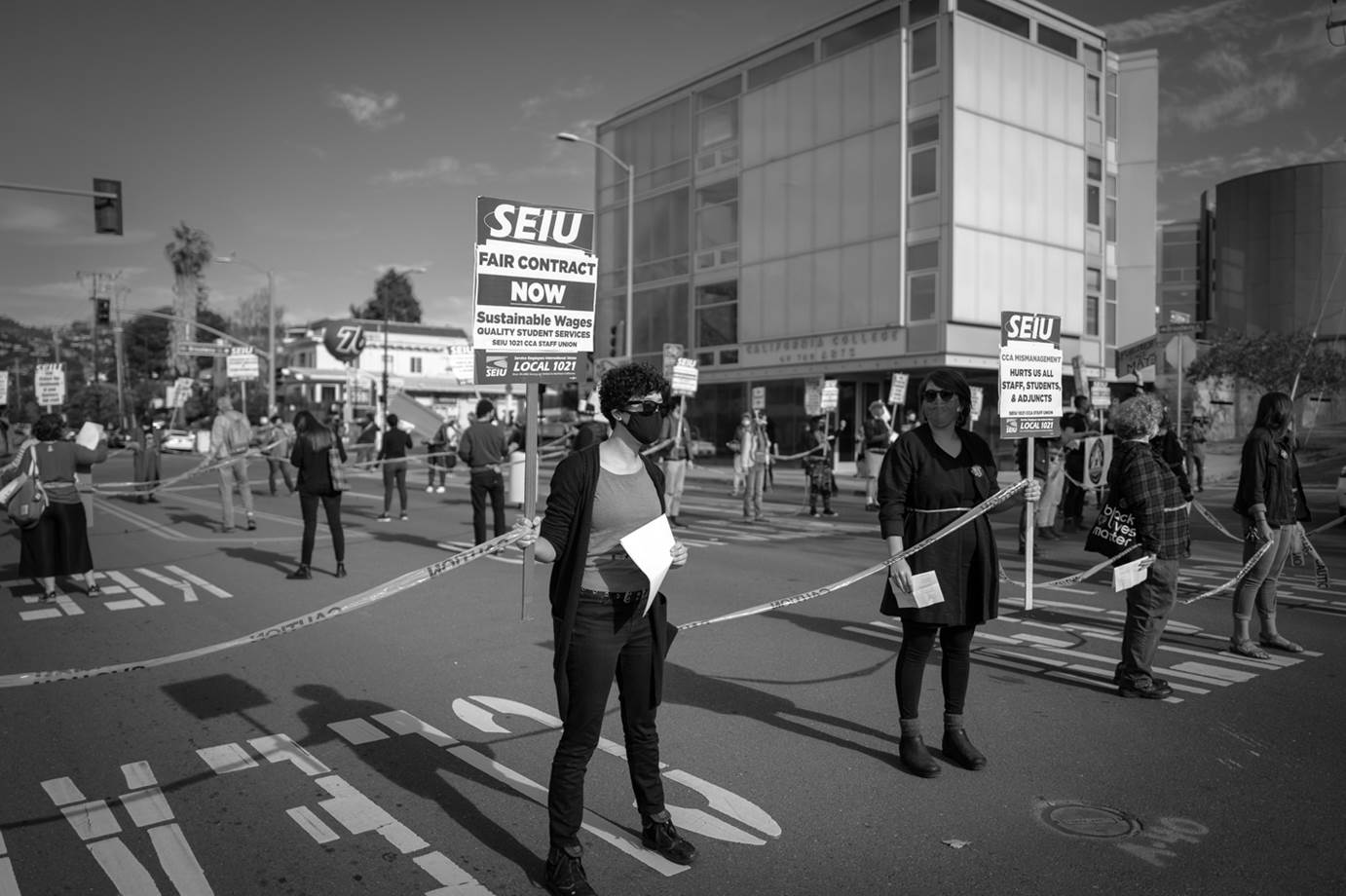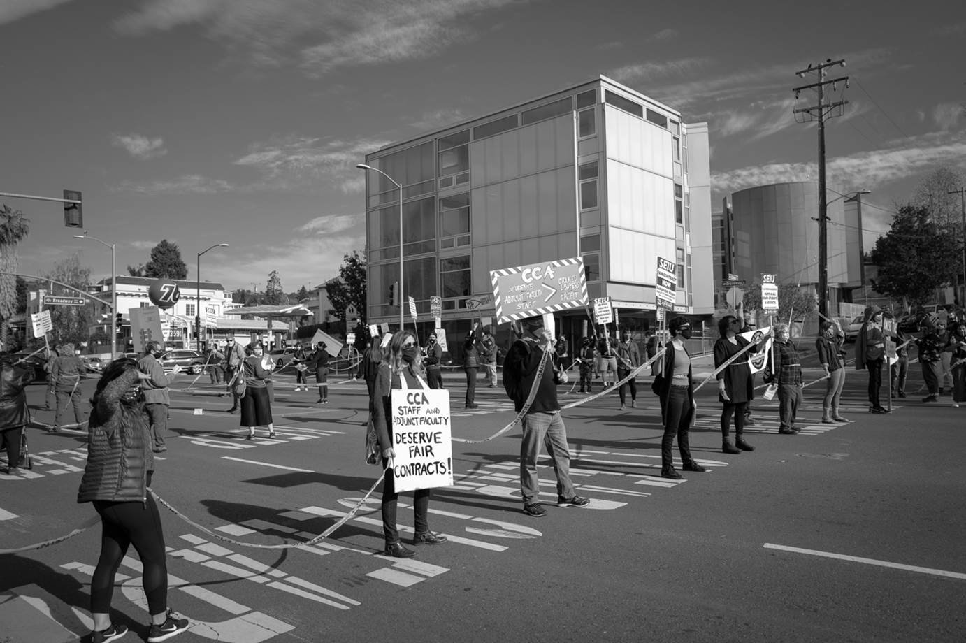 OAKLAND — Union teachers and staff at California College of the Arts (CCA) blocked traffic in front of the school’s Oakland campus on Sunday, November 22, escalating demands for the administration to negotiate a fair contract.