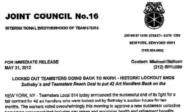 Teamsters Press Release Announcing the Sotheby's Settlement