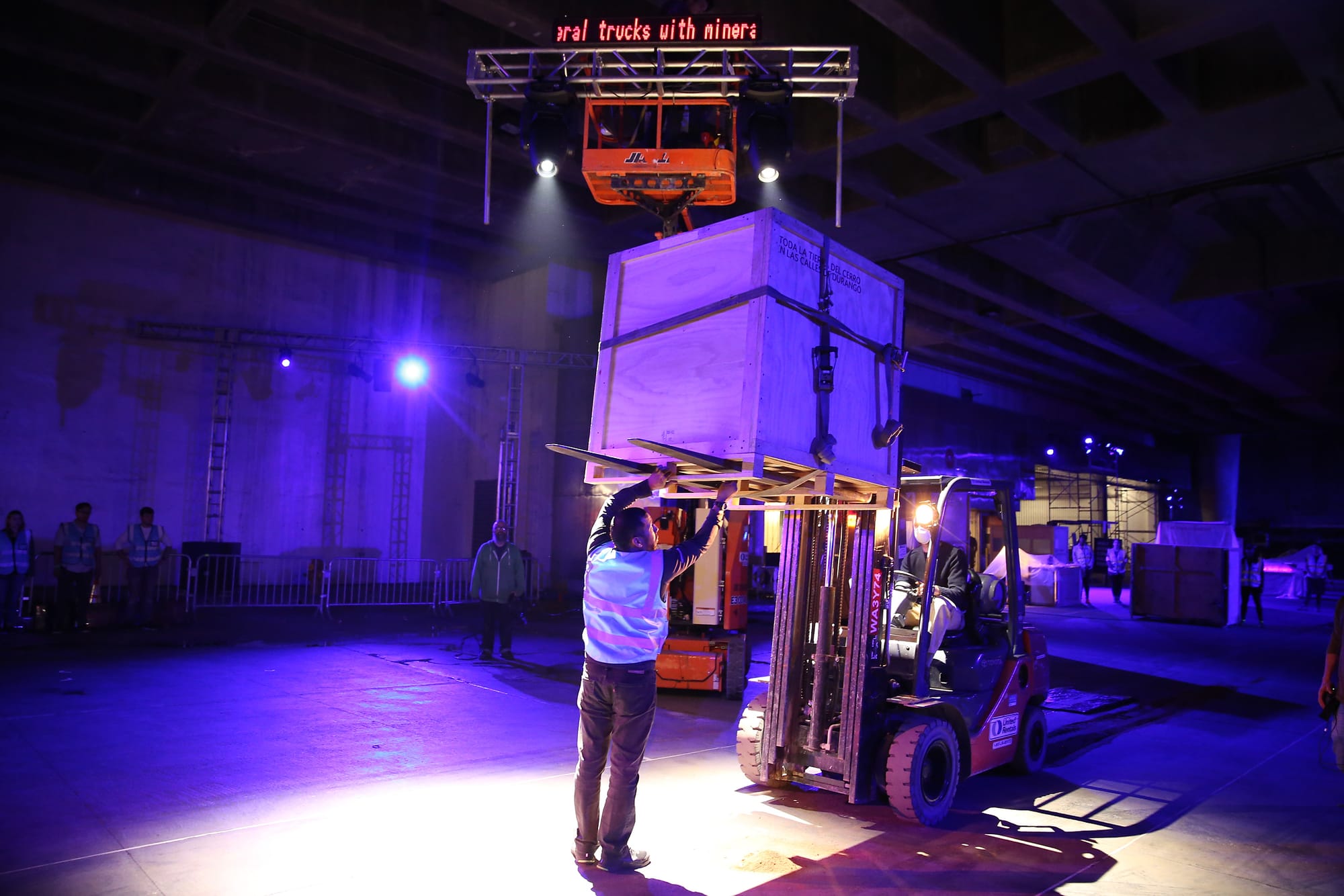 Beneath this industrial canopy, large packing boxes dotted the pavement. At the beginning of the show, monumental projections of workers in fields, presumably around Durango, were paired with text projections. The actors, all CalArts students, wore phosphorescent-green safety vests, as if on a construction site. Without speaking, they worked with the material substance at the heart of the 1966 Durango student uprisings: the iron ore-rich red dirt of the mountain, El Cerro de Mercado, in Durango. Students from Universidad Juárez occupied the mountain to protest the extraction of the ore because, they said, it failed to benefit the people.