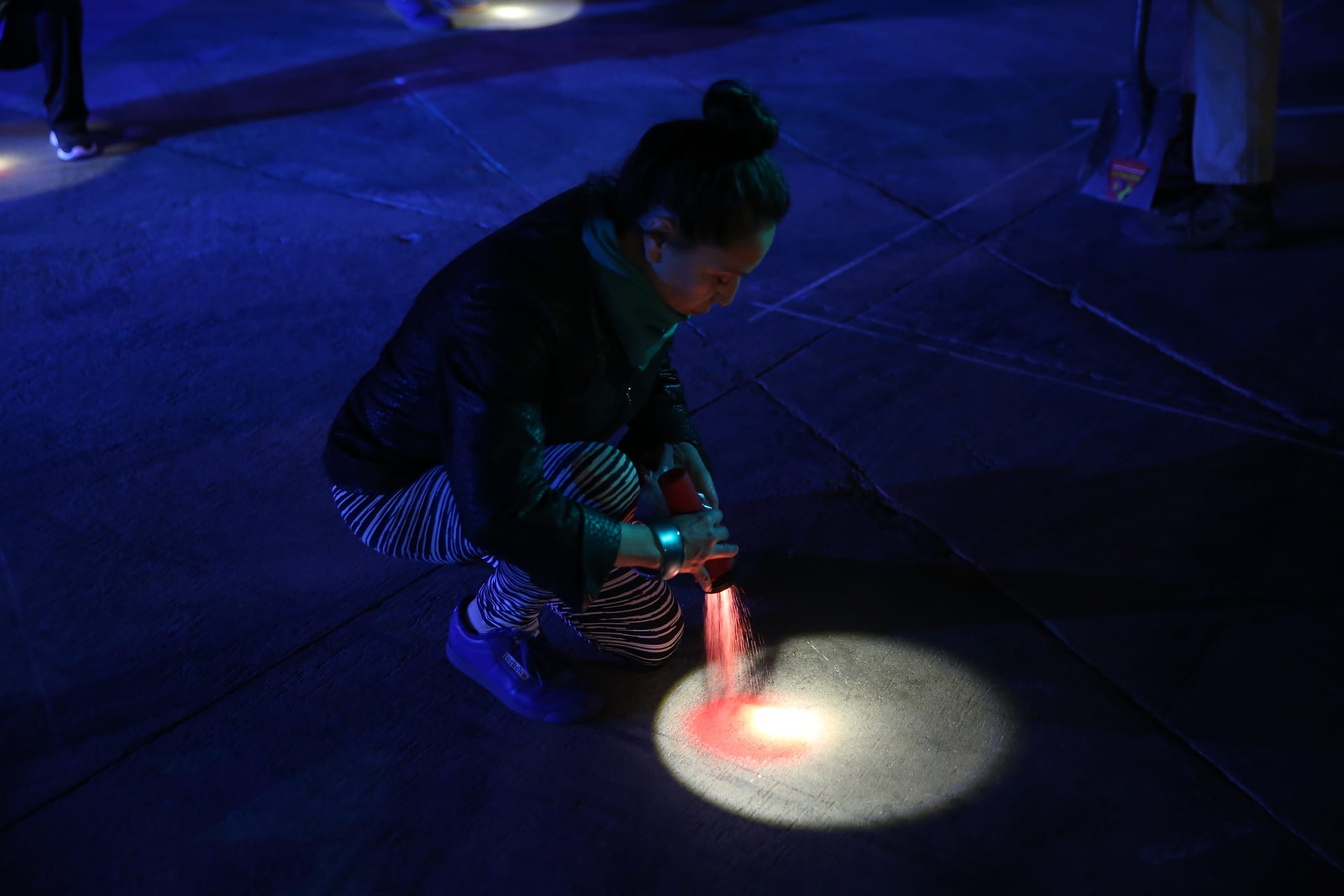 The use of the dirt itself in the performance made it marvelously specific, real, and tactile. An actor strode in carrying a heavy sack of dirt and emptied it very precisely to create a long stripe in the center of the pavement. Later, a dump truck unloaded a substantially larger quantity in a heap, symbolizing the mountain and imitating the part of the 1966 protest in which students drove trucks into Durango and dumped the dirt in public areas. An actor climbed the small hill of red dirt and delivered an inaudible recreation of a student protest speech. In between, the actors assisted with loading a dirt-filled crate onto a forklift. A cherry picker held aloft a scrolling LED device. Among the texts it displayed was, “Can a political action be interpreted as an artistic performance?”
