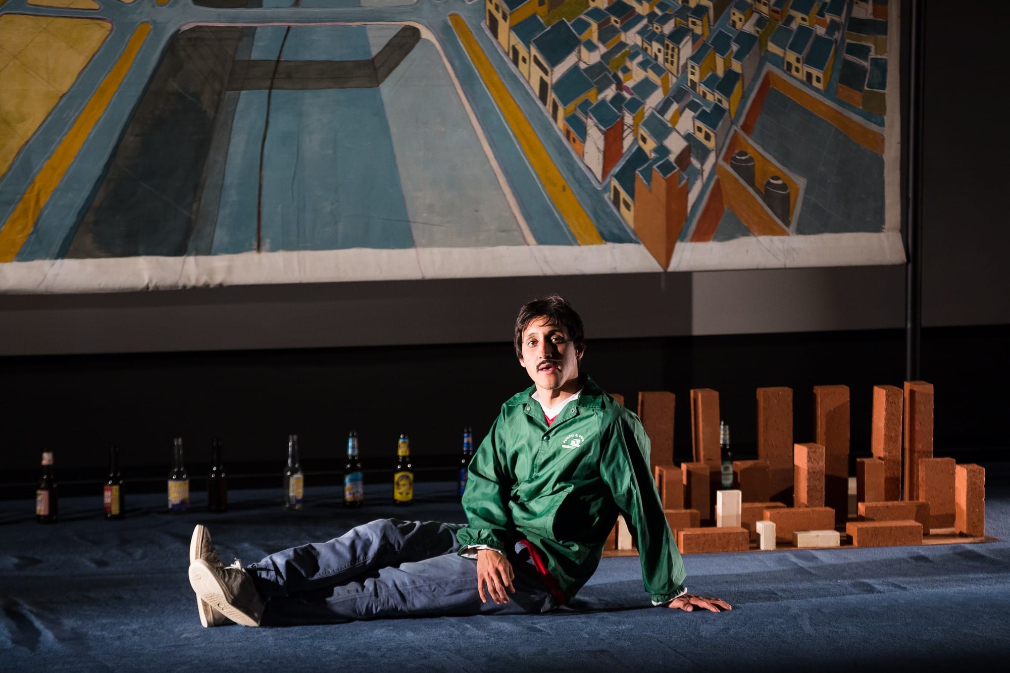 Taking quite the opposite approach to scale, the Mexican collective Lagartijas Tiradas al Sol’s Tijuana told one story in a humble, intimate stage set, consisting of an old-fashioned painted-cloth theater backdrop, a stationary screen for video projections, and a few everyday objects (bricks, beer bottles, folding chairs), in a well-calibrated production at the Skirball Cultural Center, a co-presenter of the show.
