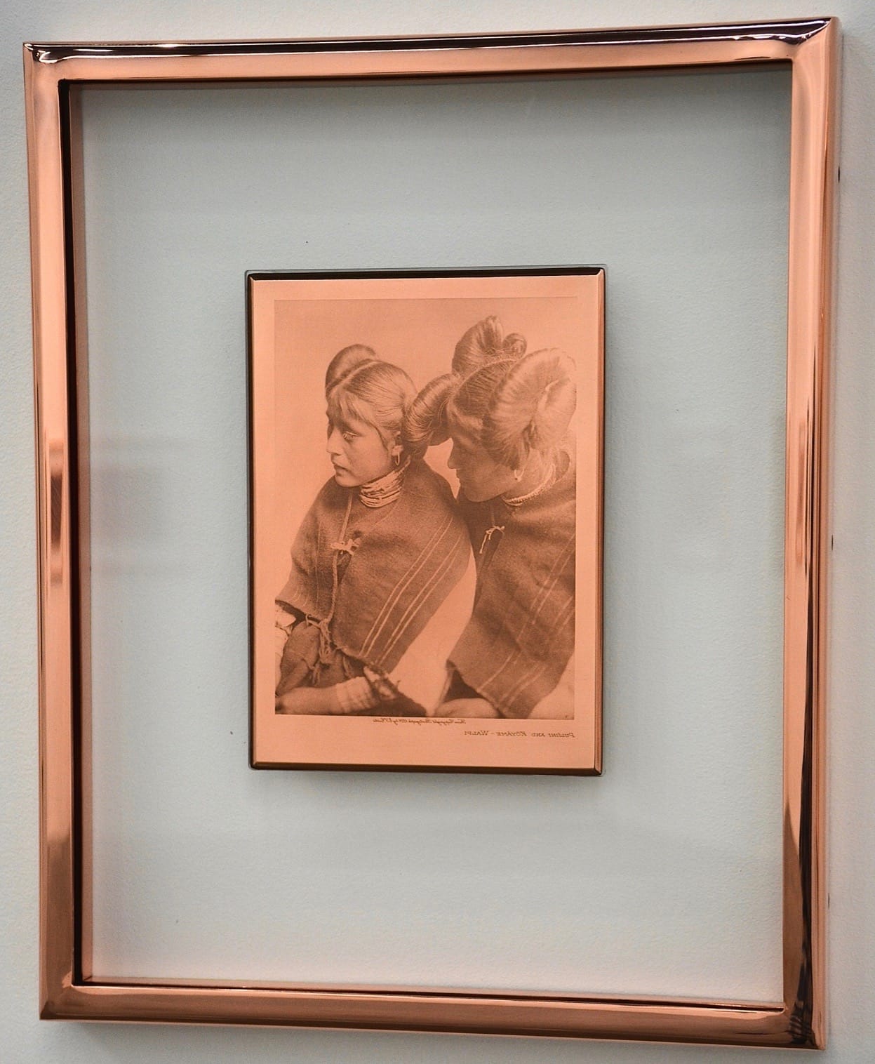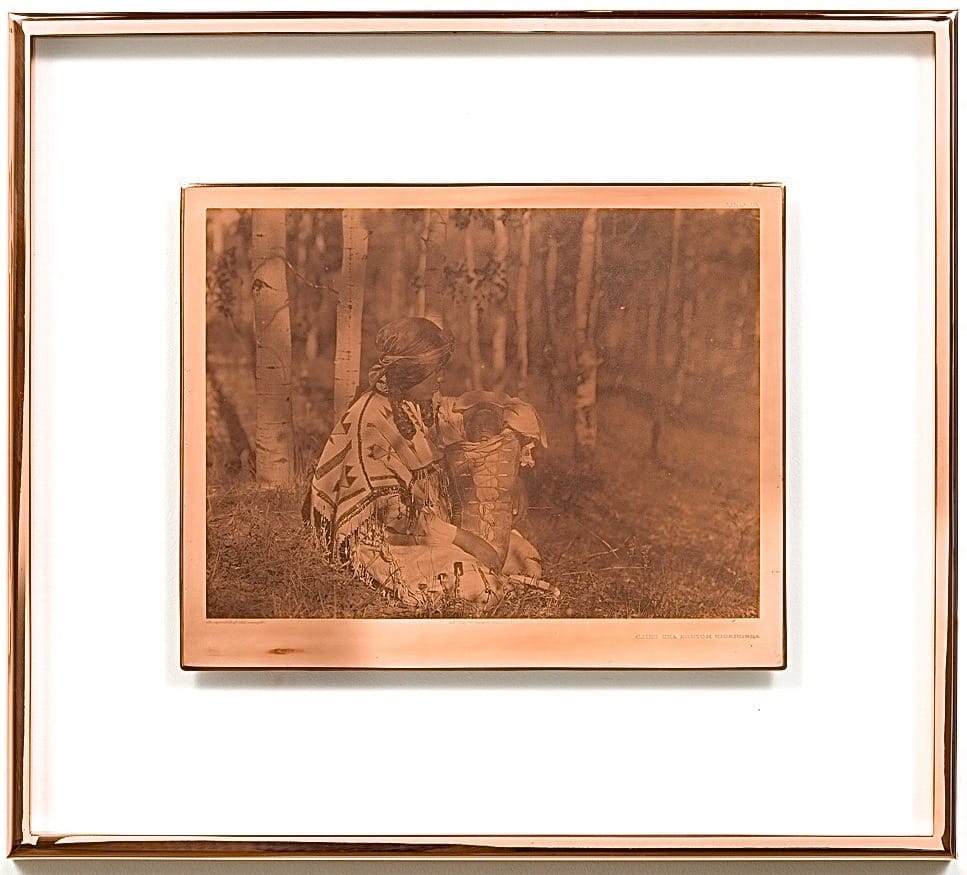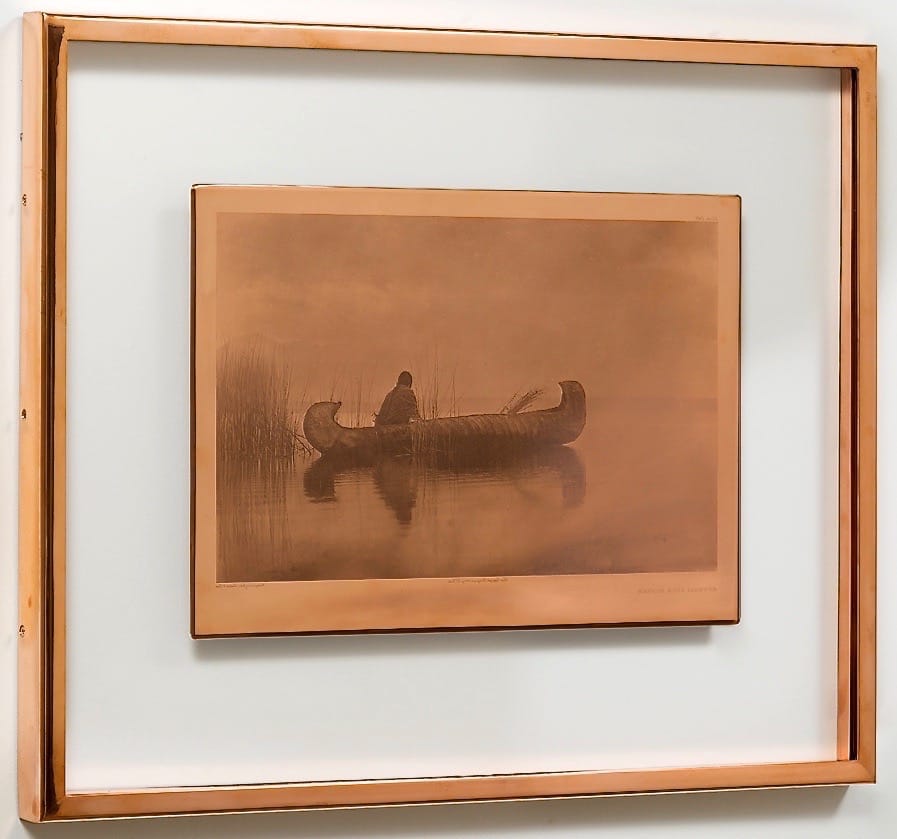 The first set of objects that mesmerized me were the copper photogravure printing plates of Edward S. Curtis presented by the Bruce Kapson Gallery. I understand that Curtis is a contested figure. He was an ethnographic photographer whose massively comprehensive project, The North American Indian, documented about 82 Indigenous American tribes in images that established for outsiders blinkered and stereotypical understandings of Native Americans. But I had never seen the plates up close. They are set within pristinely clear acrylic fields that mimic fine art photo matting with an outer frame of gleaming copper that mirrors the plates. The figures in the plates seem etched with graphite, dark against the sanguine backdrop in extravagant detail. Hair pulled into winged buns, birch bark, and still water all seem carved out of the world with a devious knife. I would rather look at the plates than the photo images made from them just about any day.
