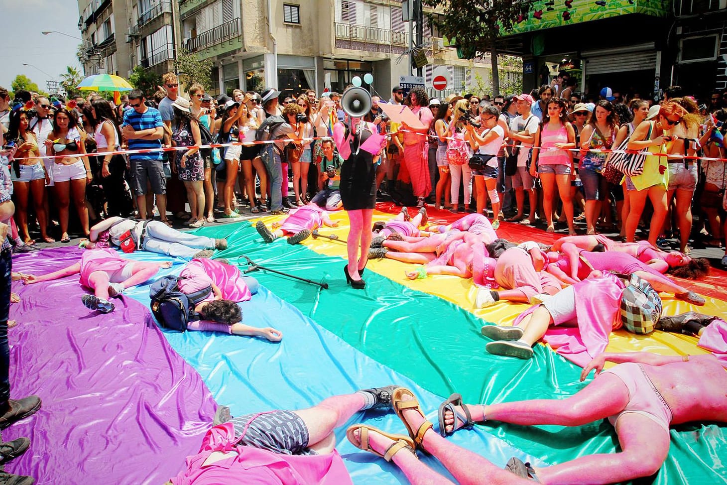 A die-in led by the collective “Mashpritzot” to boycott pinkwashing, which took place at the 2013 Tel Aviv Pride Parade (via Wikimedia Commons)