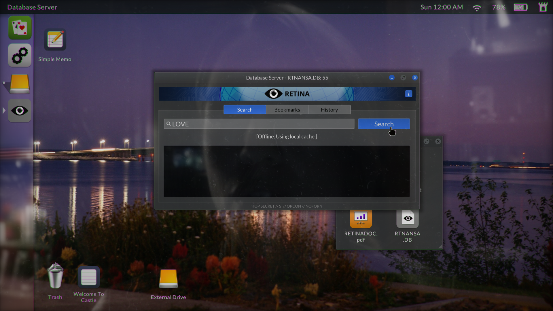In one of multiple metafictional conceits, the entire game plays out on a computer screen — that is, one besides the one you’re already looking at. An initially unnamed woman plugs a hard drive into her computer and opens up “Retina,” a government tool for archiving and sorting through surveillance information (all of which was performed and shot with real actors). Stored on the drive are hours’ worth of context-less video clips — chat sessions with only one participant’s side of the conversation, footage from hidden cameras, social media posts, etc. The player is tasked with viewing the clips and gaining an understanding of the events they portray. Your only method of pulling clips is putting keywords into a search bar, which will then trawl the transcripts of the videos to present relevant ones from the database.