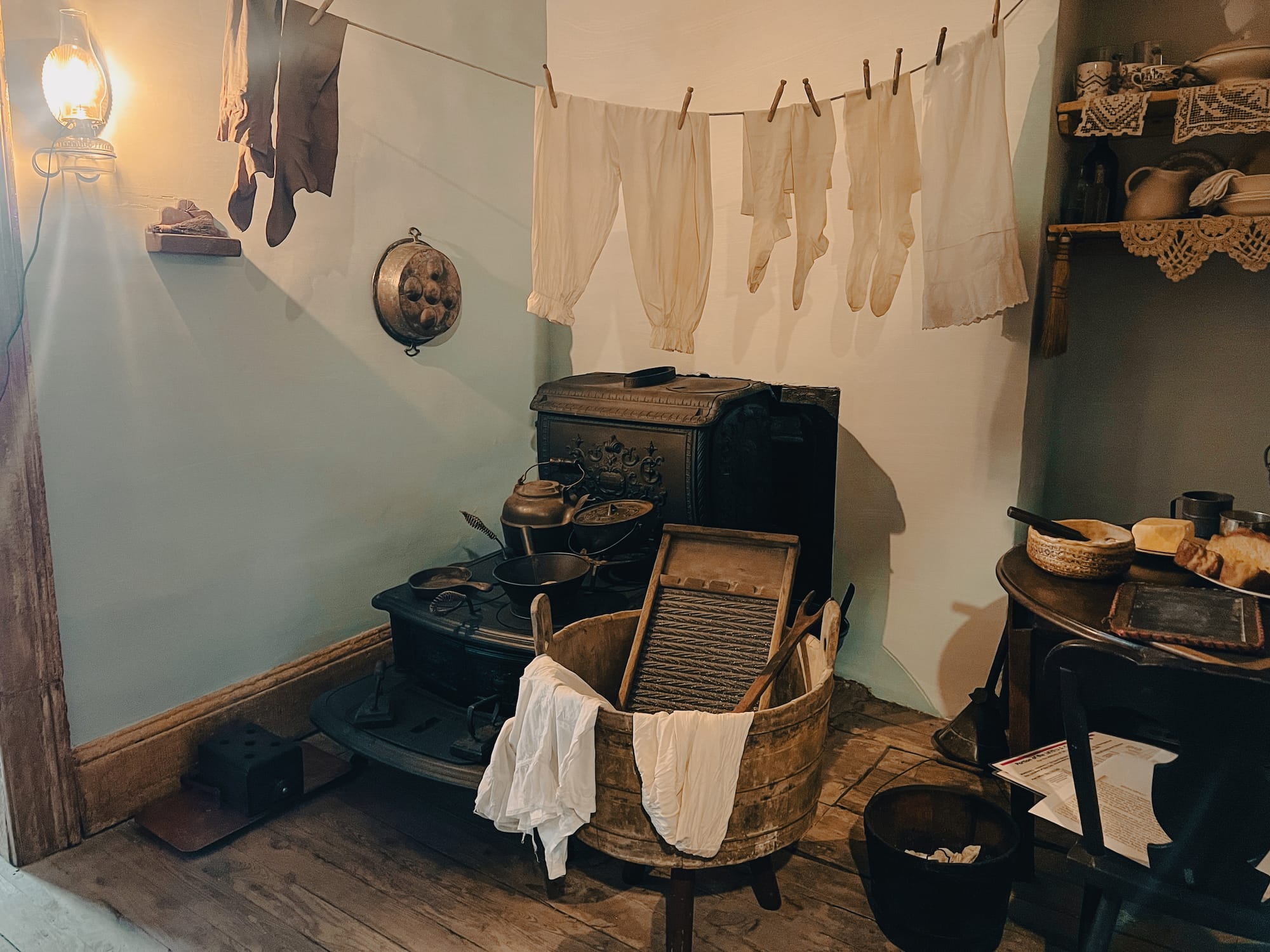 The recreated home showcases Rachel Moore's laundry setup and Kennedy's sewing supplies. It also includes a few common foods, such as oysters and a turkey (a detail the researchers gleaned from an essay recounting a laundress receiving one as payment). A portrait of Abraham Lincoln rests on the fireplace mantle. Two bedrolls are stacked in the closet; all five residents slept in the apartment's two tiny rooms.