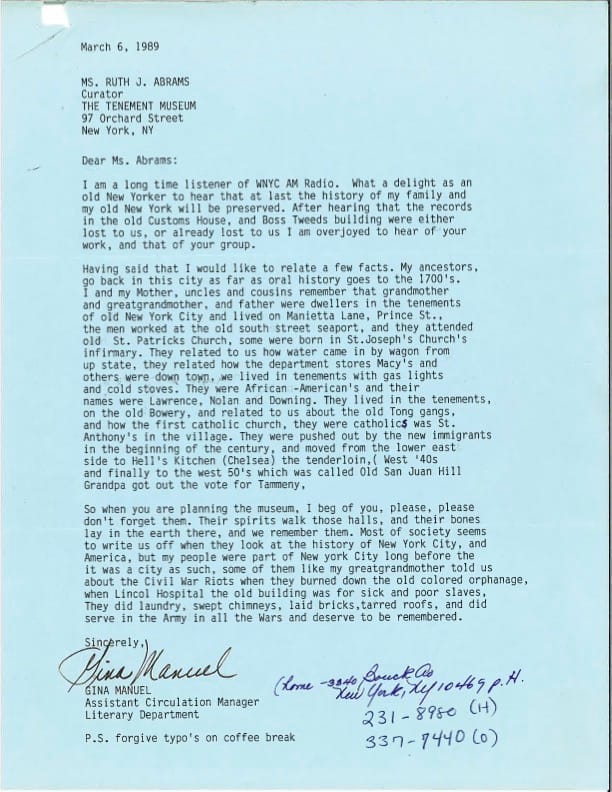 The team relied on writings by Black individuals from the time period, and early on in the research process, they found a 1989 letter in the museum's archives penned by a librarian named Gina Manuel. The missive detailed her family's long history in the city and urged the co-founder of the newly established Tenement Museum to explore the stories of Black New Yorkers like herself, a request that would take over 30 years to come to fruition.