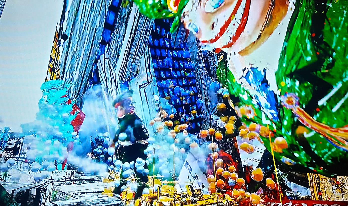 Some works document literal, real-world acts of political resistance, such as “Today, I am just a butterfly sending you a sentence” (2016) by Portuguese artist Patricia Almeida. The seven-minute video dissects and contextualizes footage of activist Josephine Witt’s demonstration against the European Central Bank in April of 2015, wherein she jumped on a table in front of President of the European Central Bank, Mario Draghi, and shouted, “End the ECB dictatorship!” and threw a handful of confetti (that she likened to butterflies), before being arrested. Another, “This Lemon Tastes of Apple” (2011), captures the direct involvement of Iraqi artist Hiwa K in a march on the last day before the two-month ban of protests against the Kurdish Regional Government that occurred in Iraq, Turkey, and Iran. Hiwa K is documented moving through the protest march, playing on a harmonica, but the situation devolves into conflict around him, as tear gas is introduced to the crowd. The lemons referred to in the title are a means used by protesters to protect themselves from the tear gas, the smell of which is reminiscent of apples.