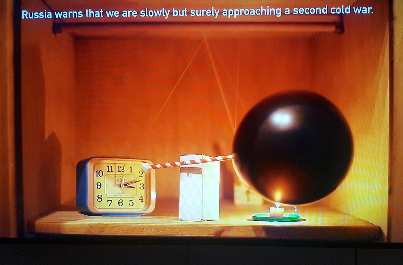 Other videos take a more abstract approach. Three works by Italian artist Federico Solmi, collectively titled Chinese Democracy and the Last Day on Earth Video Trilogy (2011–2014), present a loose narrative and surrealist whirl of political symbolism in a jarring mono-channel animation. Cartoonish dictators and bloodless politicians move through landscapes of corporate logos and flag motifs. There is little sense of specificity, and yet the characters and scenarios feel disturbingly identifiable and common — political machinations have become as predictable, impersonal, and codified as ballroom dance.