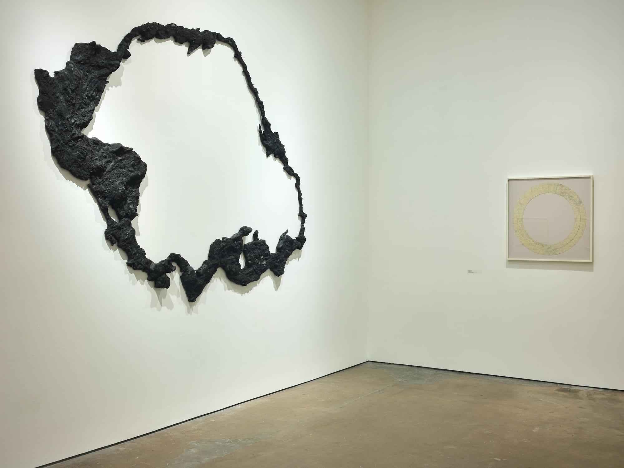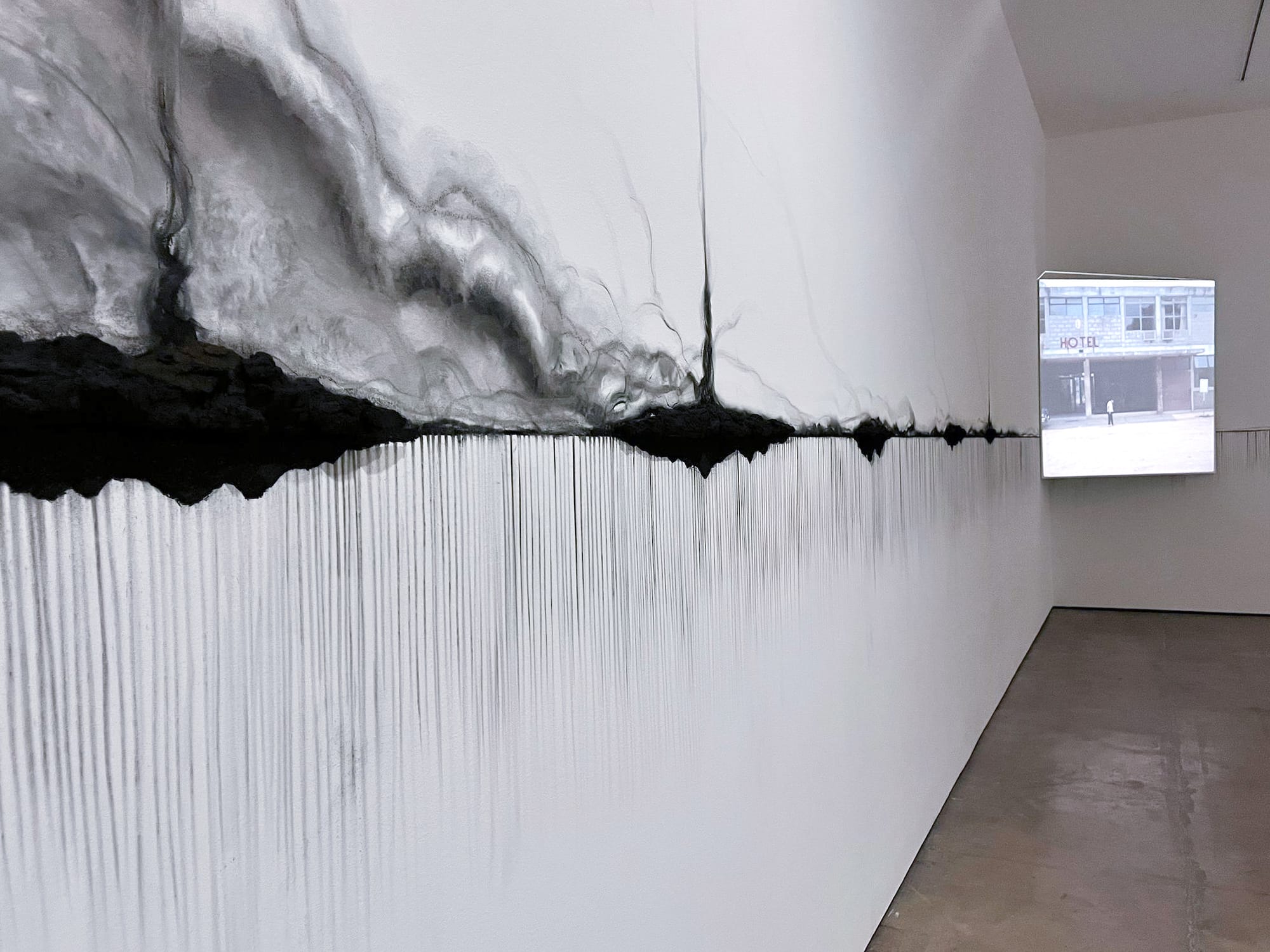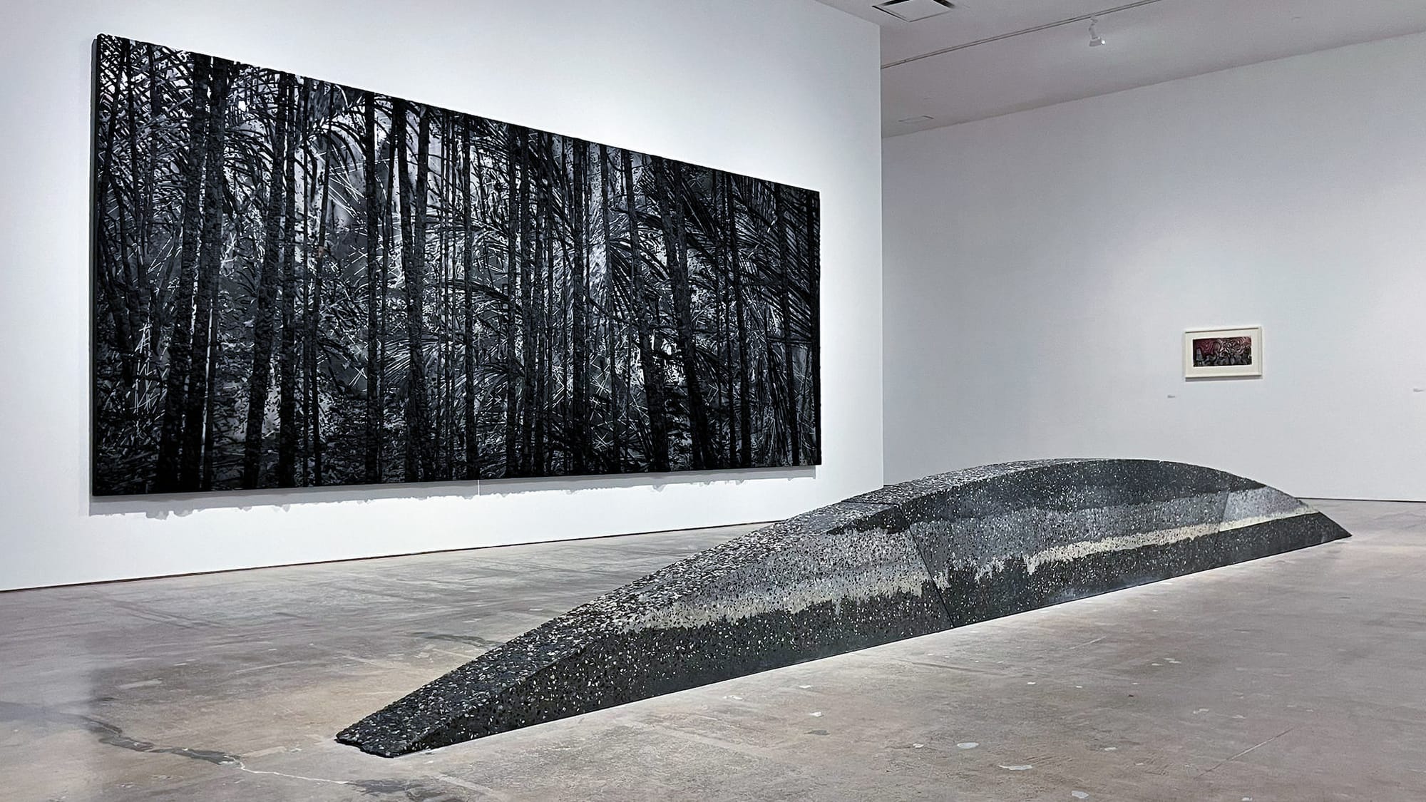 Fernández’s “Charred Landscape (America)” (2017) encircles the same room, installed alongside the walls, and traverses the screen upon which Smithson’s pictures are projected. The installation’s abstract charcoal landscape evokes the power of fire as a symbol of Western violence and the use of controlled burnings by Indigenous people in their agriculture.