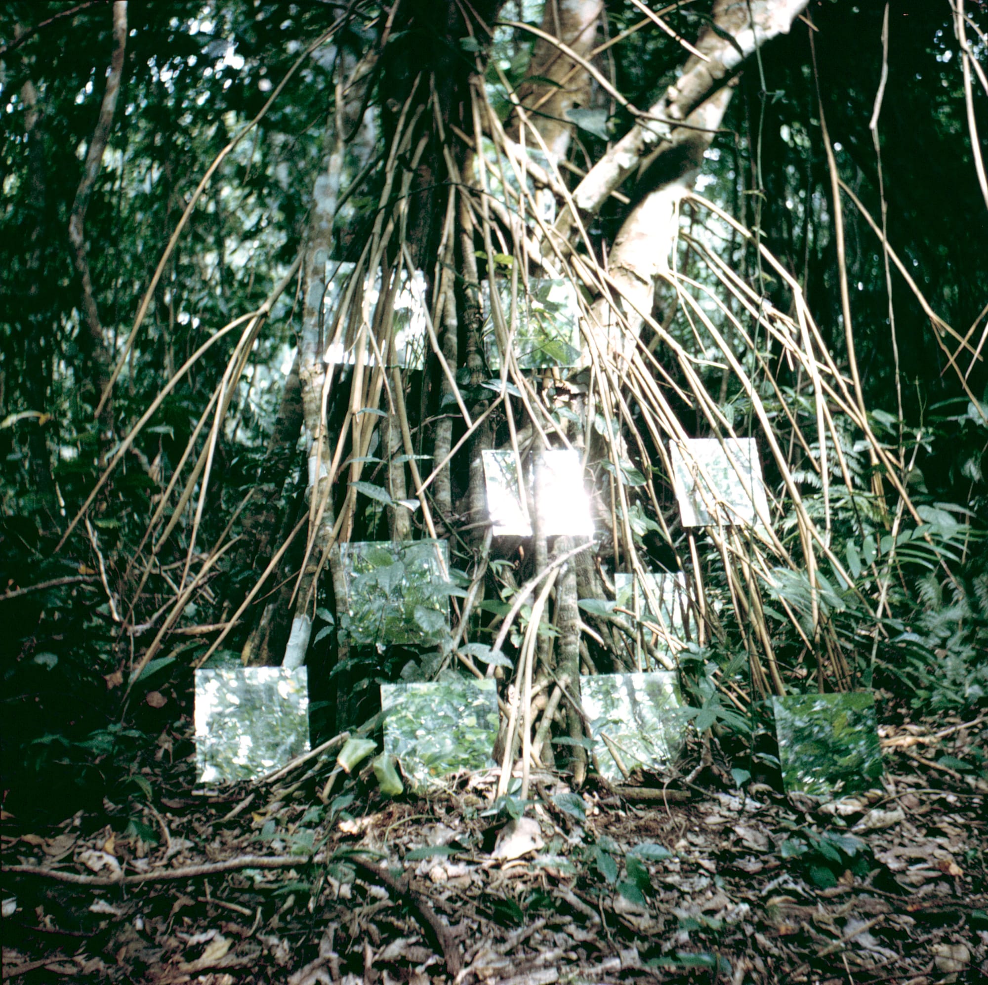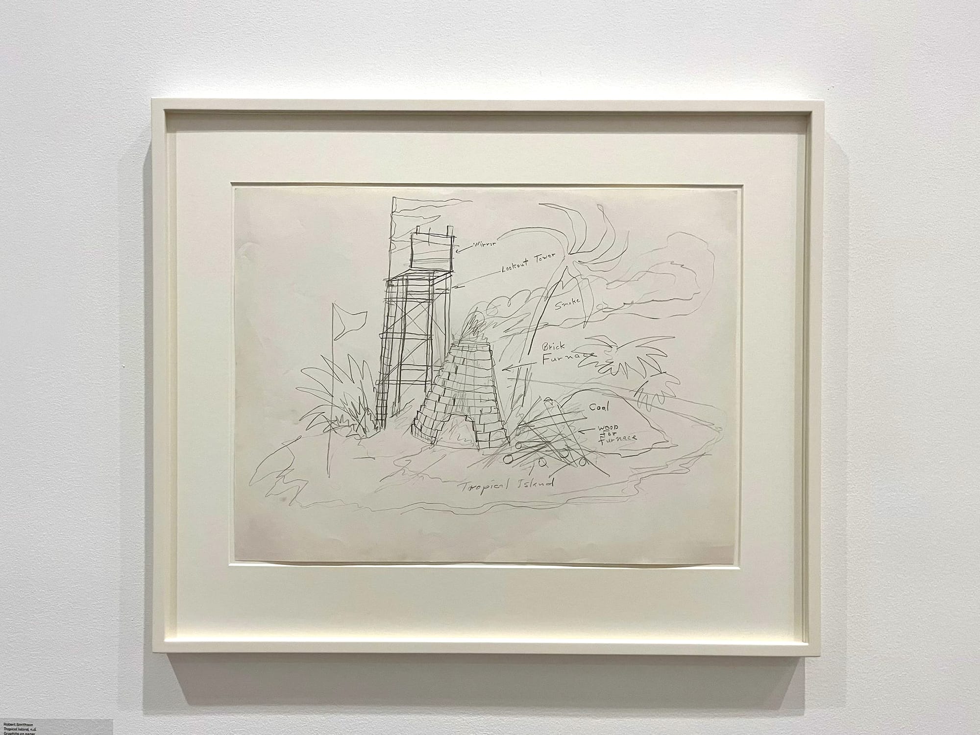 The dialogue between these two works sets the tone of both the exhibition and the conversation it initiates between the two artists. Their practices overlap in their use of landscape as inspiration and subject matter, and of raw natural materials. Yet the artists’ approaches could not be more different. Fernández emphasizes the way structural power dynamics, such as neocolonialism and cultural and resource extractivism, affect how humans relate to place. In “Manigua (Mirror)” (2023), the entanglement of these geopolitical relationships is characterized by an abundance of tropical fauna. Behind charcoal and black sand, a layer of aluminum faintly reflects the figure of the spectator, inviting us to consider our individual roles in a globalized system. Smithson, on the other hand, evades self-reflection, both figuratively and literally, in his work: in “Yucatan Mirror Displacements” (1969), mirrors reflect nature but the work does not acknowledge the reality of humans' ever-changing and complex interconnection with our environment.