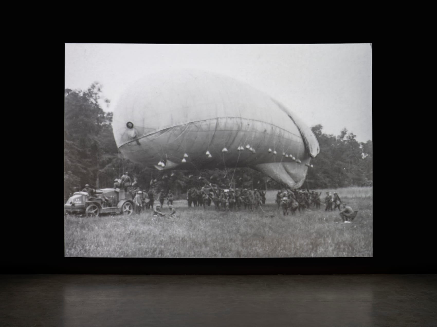 Adkins constructed this video from early 20th-century black and white stereoscope images of dirigibles, hot air balloons, airplanes, gathered crowds, and soldiers. Antiquated aerial weapons and garb evoke World War I, or perhaps the moments before the war when much of Europe was preparing to gnash itself to bits. Buoyant optimism is conveyed, but also agitation, as the still images fluctuate. Soon would be bloody mayhem.