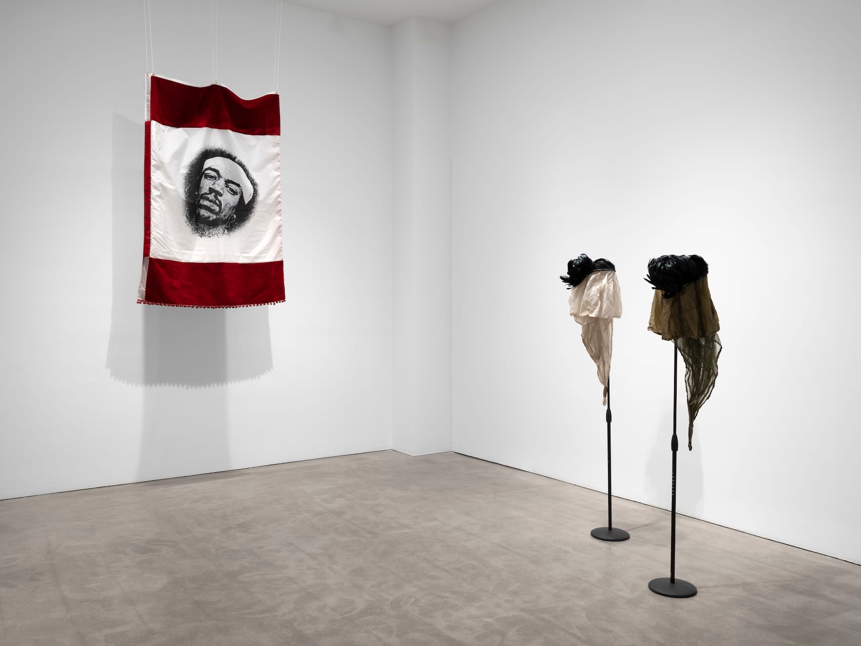 Several other works refer to Jimi Hendrix’s stint as a paratrooper, some enfolding him within Catholic iconography and mythology (Adkins was raised Catholic). A black and white silkscreen on polyester portrait of Hendrix appears on a red velvet flag; he’s positioned as a saint in a work that recalls a religious artifact (“Hendrix Flag,” 2012). In the same room are two upright sculptures, both made of a microphone stand, a parachute, and feathers; both titled after archangels. In “Adnachiel” (2012), a parachute suggesting an angelic robe envelops part of a microphone stand; atop are dyed black feathers, perhaps alluding to the feathers that Hendrix often wore. Hendrix’s paratrooper experience, his spectacular musicianship, his political and mystical import are succinctly conveyed.