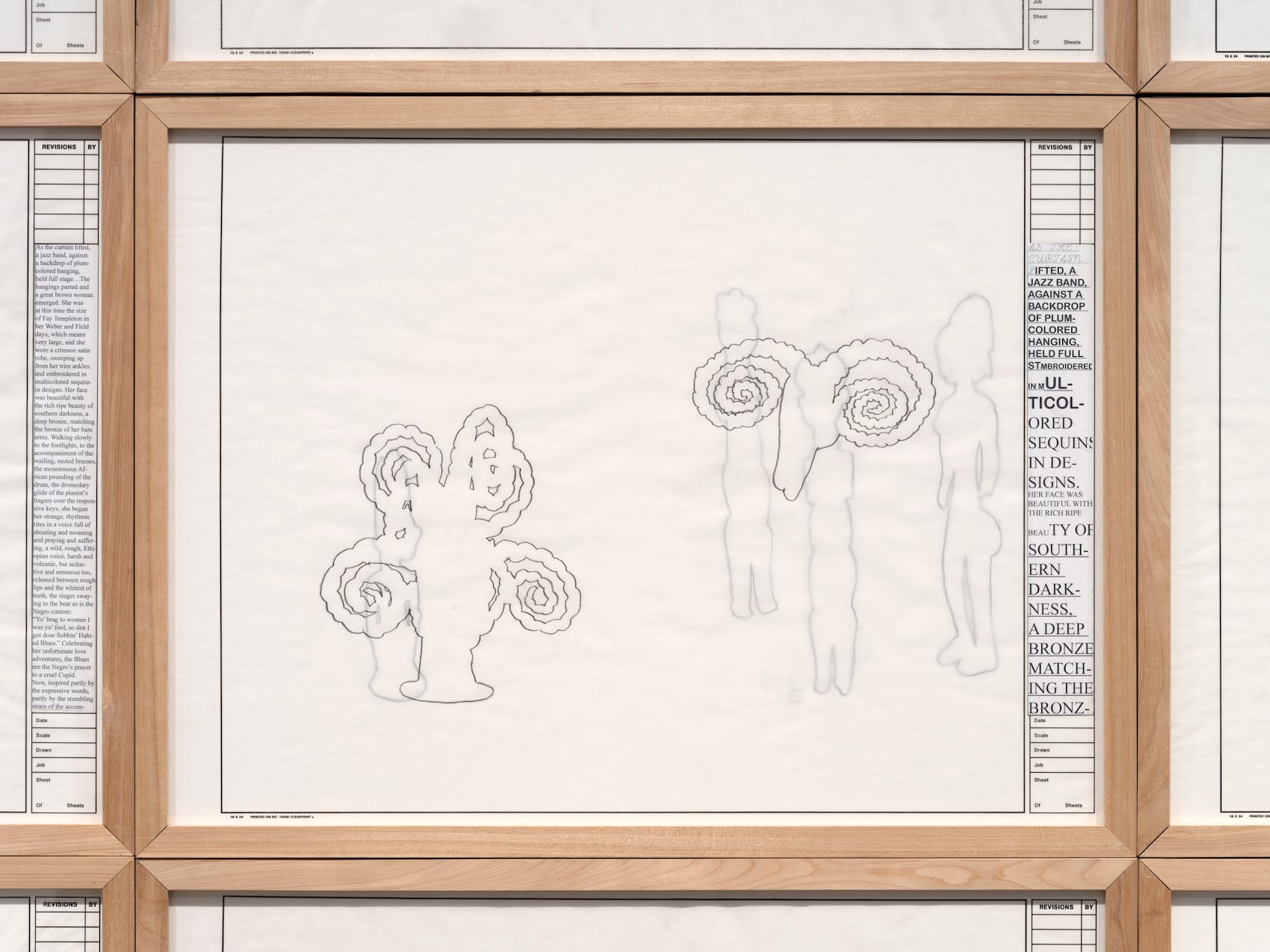 “Audience (From Belted Bronze)” (2007–8) was part of the same recital as “Matinee.” Twenty-eight framed drawings displayed as a grid on the wall show silhouette-like people, mysterious beings, and various objects. To the right of each drawing is an excerpt from a 1926 Vanity Fair review by Carl Van Vechten — the white critic, author, and photographer so identified with the Harlem Renaissance — of a Bessie Smith performance. Adkins altered the typography to accentuate different parts of the text. While Van Vechten extols and indeed marvels at Smith, almost 100 years later it is disconcerting, even painful, to read of her “wild, rough Ethiopian voice” and her face “with the rich, ripe beauty of southern darkness.”