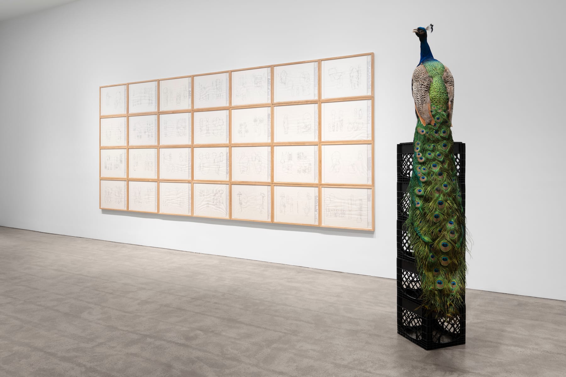Surveying the drawings from a distance is a taxidermy peacock, likely a stand-in for the flamboyant Smith, perched atop five black milk crates. The peacock is gorgeous and dramatic, but the milk crates — mundane, much-used, rickety, and oddly transcendent — are just as compelling. Adkins had an almost alchemical ability to transform forgettable, workaday stuff into resonant objects of wonder. While he exhibited extensively during his life, many of his shows were at venues like university galleries, far from the limelight. This exhibition underscores not only how engaging and innovative, but also influential and visionary Adkins really was, and remains.