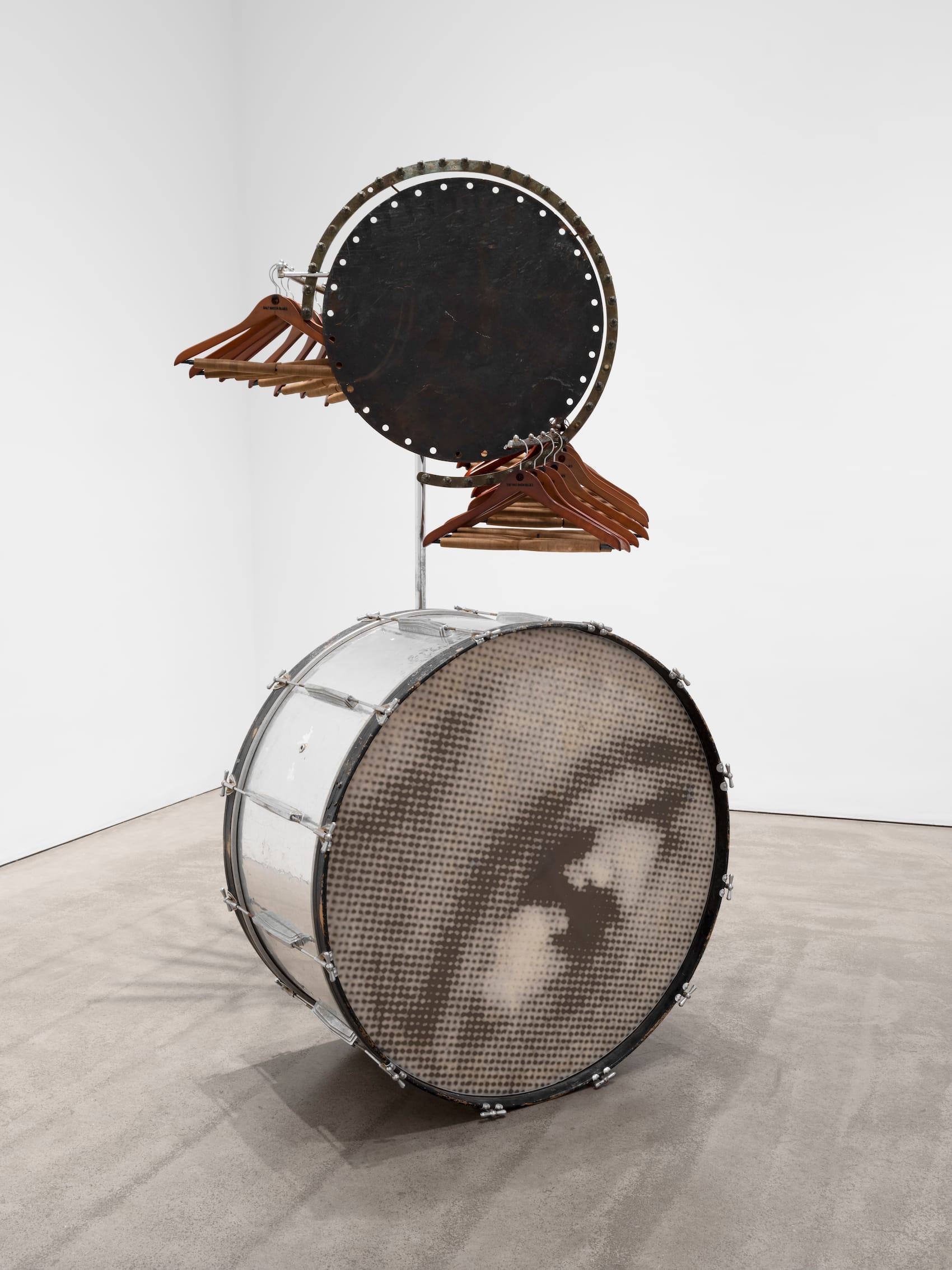 “Matinee” (2007-13) addresses famed blues singer Bessie Smith (1894-1937), the so-called “Empress of the Blues.” A large brass drum on the floor sports an image of Smith’s eye, suggesting her as a seer and spiritual guide. Protruding above is a bronze orb set in a steel armature; dangling from the edge are wooden coat hangers, each inscribed with a Smith song title, among them “Graveyard Blues,” “Lock and Key Blues,” and “The Has Been Blues” — a remarkable body of work that addresses poverty, incarceration, racism, stubborn endurance, and the desire for freedom, among other subjects.
