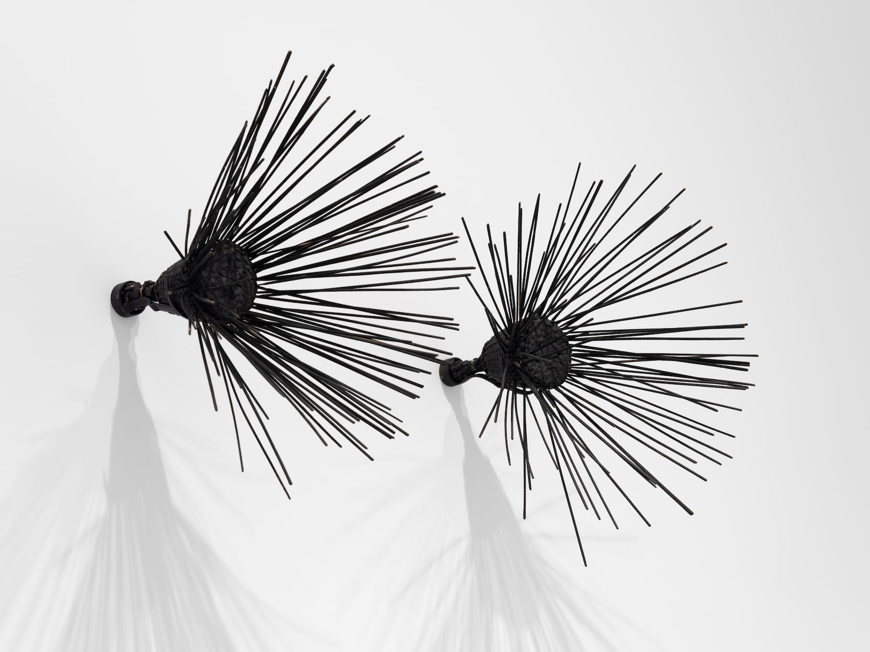 Nearby, on the wall, are two black rattles, each sprouting black incense sticks that cast feathery shadows on the wall (“Pine,” 2003). This elemental work, organic in appearance, is terrific. The checklist bills the rattles as simply that, but I’m guessing they are from Adkins’s extensive collection of artifacts, which included various African musical instruments. With their implicit sound, aromas, lustrous hues, and varied materiality, these idiosyncratic objects have talismanic power.