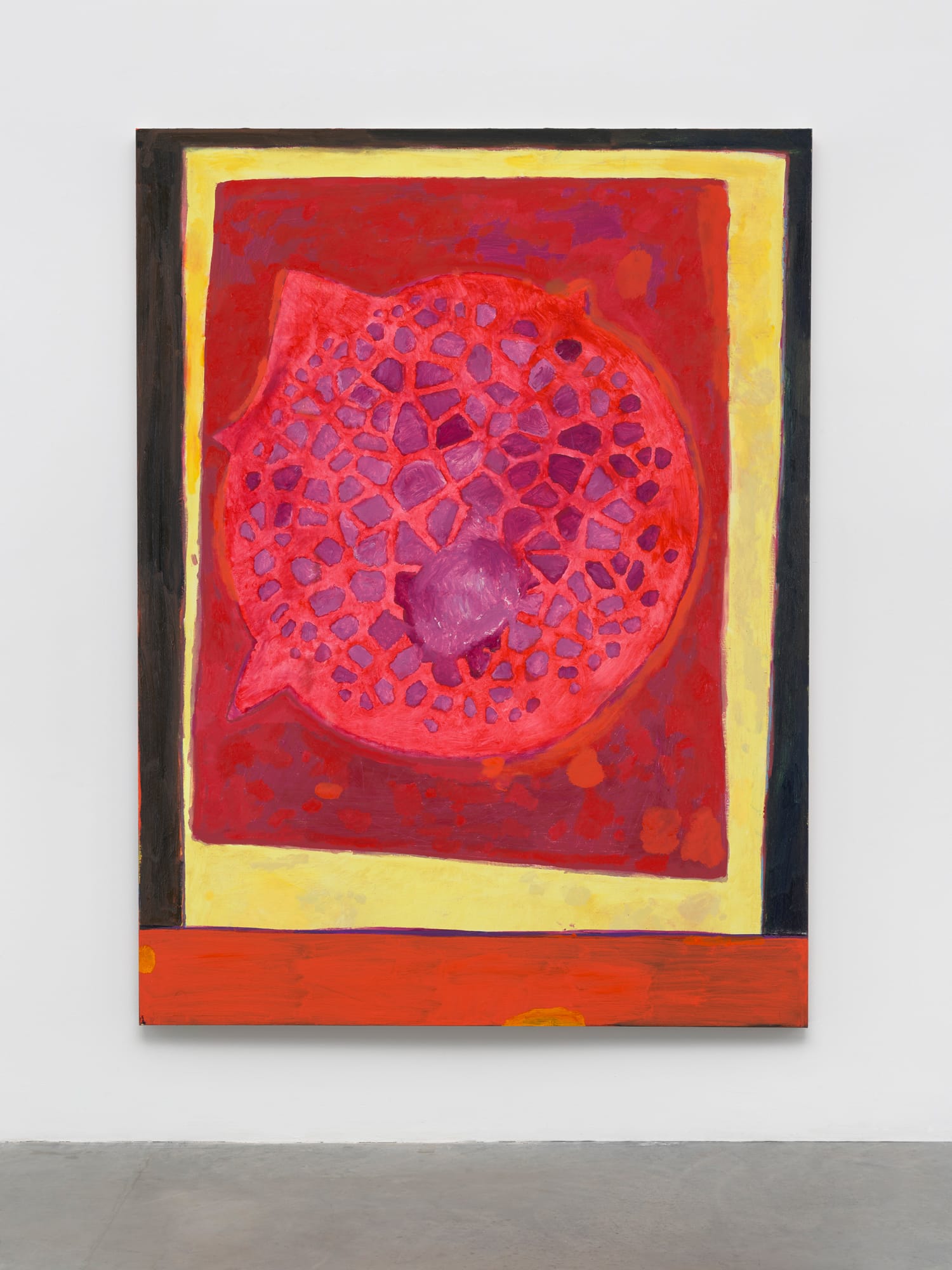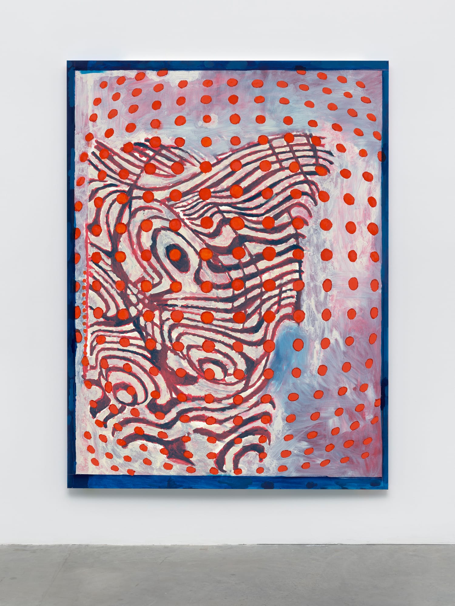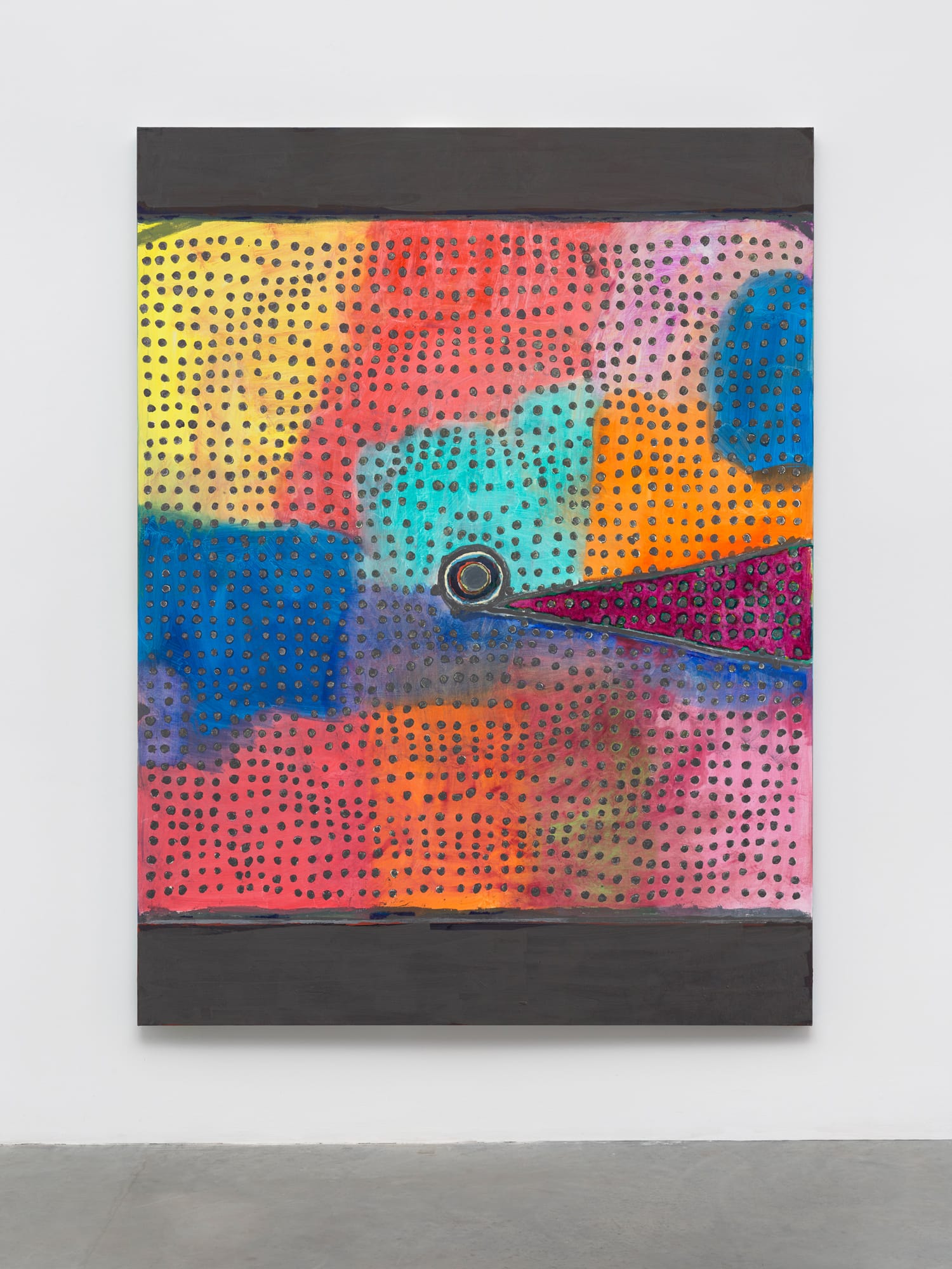 The desire for surprise runs through the strongest paintings in this exhibition. You get the feeling that the brownish-red shape in “Cinnabar” is going to change or the bulging grid of red circles in “Frame” is going to burst through the picture plane. This sense of a world undergoing constant change is a central feature of this work. How we might understand this vision without it becoming simplistic or reductive is just one of the reasons I keep looking at and thinking about Winters’s art.