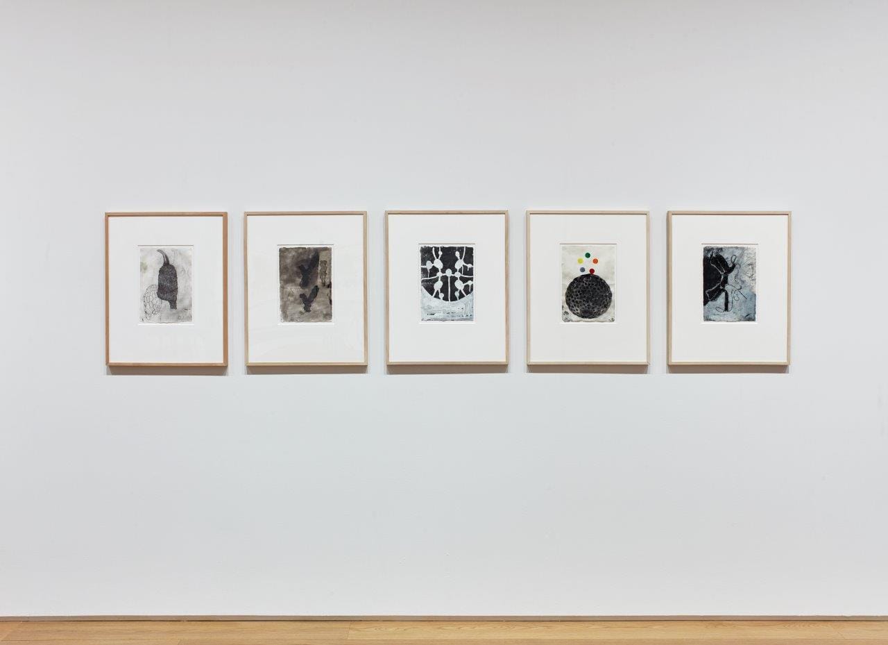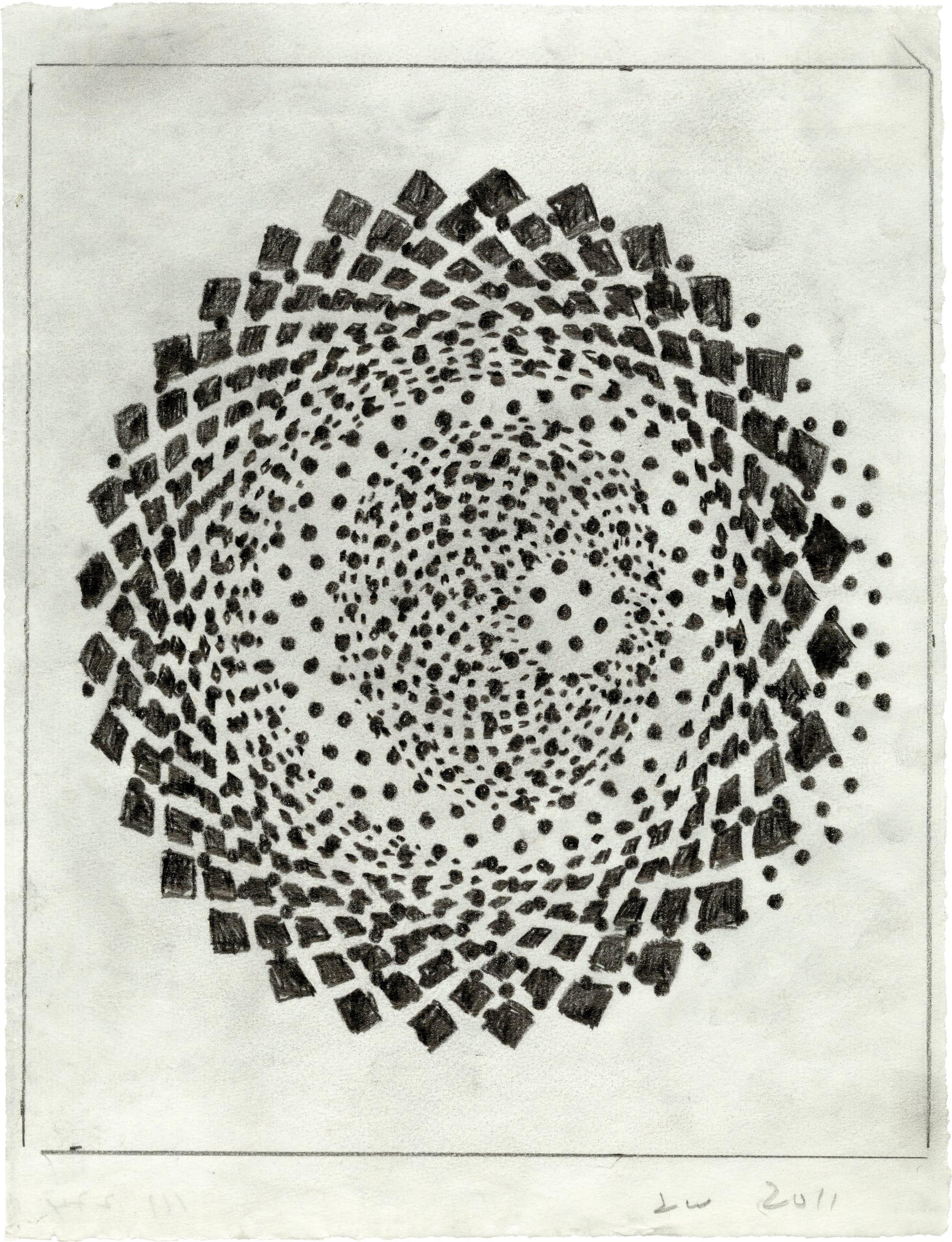 Winters often places forms in the center of the composition and composes them of units dispersed more or less evenly across the paper’s field. Attention shifts between the overall form and the individual units, or moves between the formal and the scale shifts of the units, which conveys an internal movement within an otherwise static form.