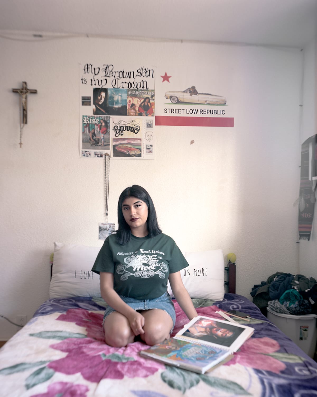The show includes its own newspaper, packed with interviews in which participants narrate their immigration stories, some heartwarming, others harrowing. “The answer to my asylum case could arrive any minute,” says Yuri, for whom Guatemala is too dangerous to return. “Every day, when the envelopes come through the mail slot, I run with excitement and fear, looking for the answer.” Gregory photographed Yuri — wearing heels, a colorful jacket, and a look of confidence that suggest a destiny of her own — in her living room, a small refuge from the world.
