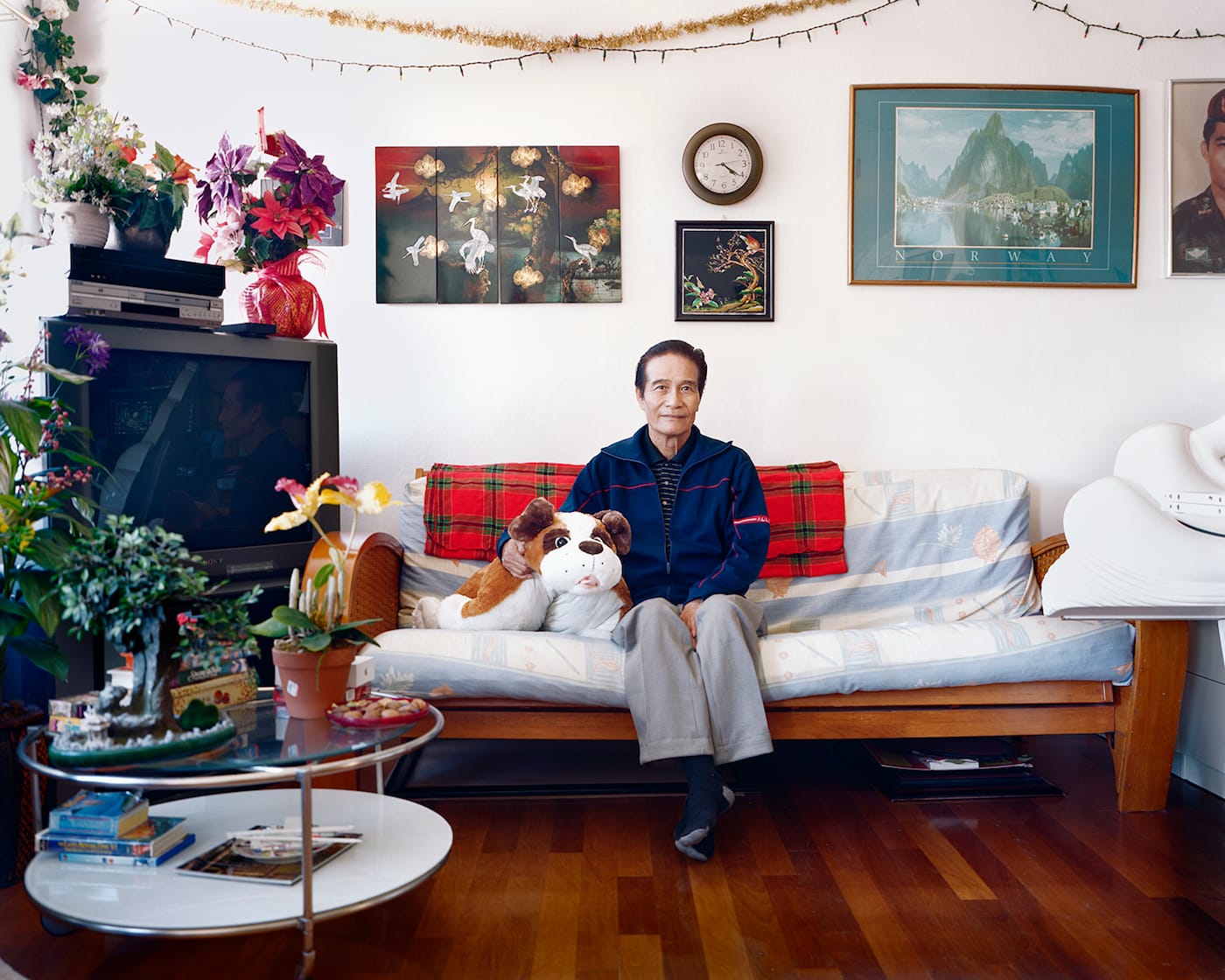 Khanh, an 80-year-old Vietnam War refugee, appears in an intimate portrait, one of several by Gregory, perched on his living room couch. He’s surrounded by the familiar clutter of domestic life: plants, a stuffed animal, a coffee table stacked with objects, a framed poster of Norwegian fjords. The image says nothing about his flight from Vietnam on a fishing boat, or the wife he left behind. Instead, it captures the security and creature comforts of home.