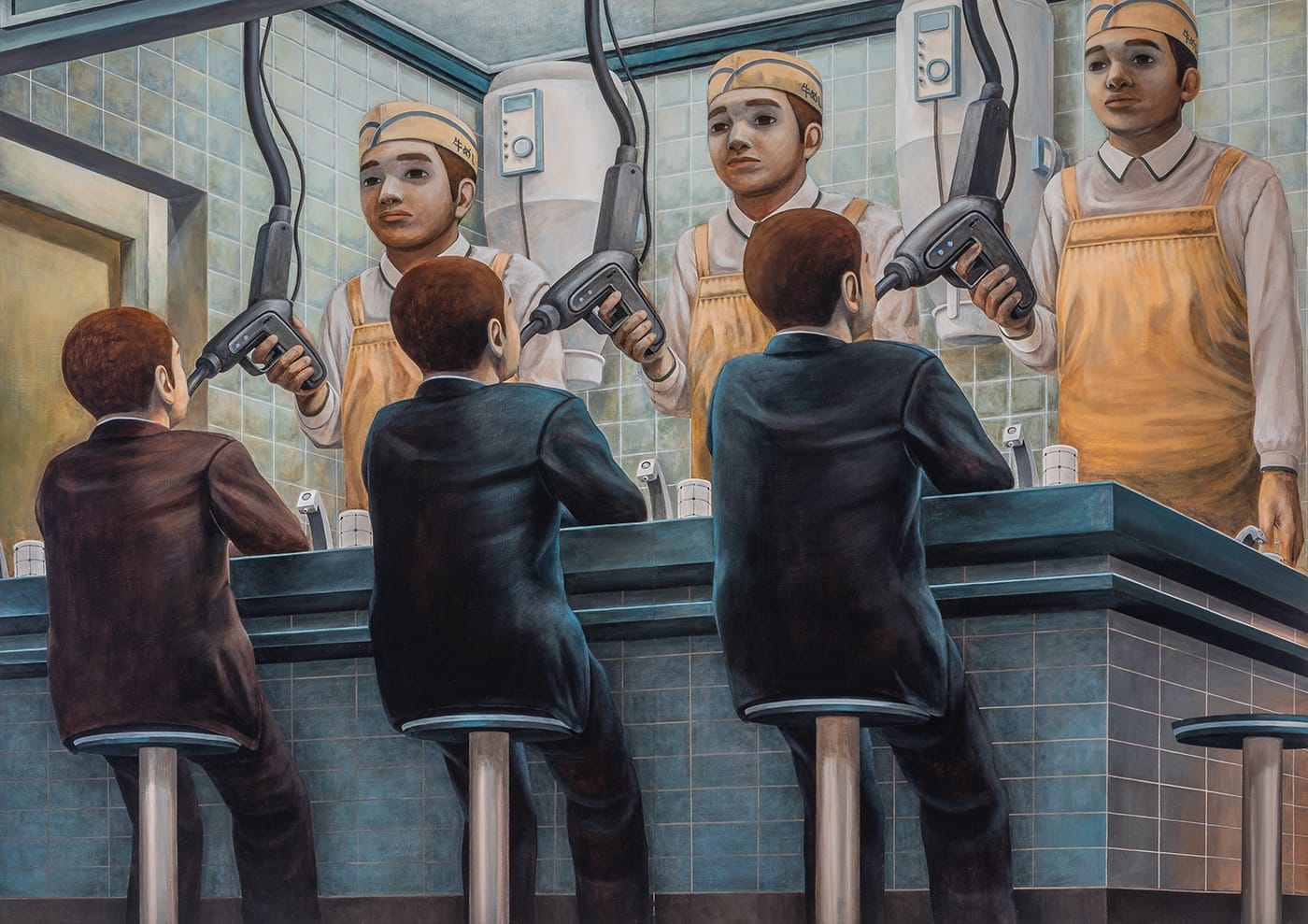 In chilling paintings like “Nenryō Hokyū no yō-na Shokuji” (“Refuel Meal,” 1996, acrylic on board), Ishida nailed the anonymity and anomie of the life of the typical Japanese sarariman (salaryman), or corporate office worker, whose mission in life is to meet sales quotas, pledge fidelity to his employer, and, if necessary, labor to the point of karōshi (death from overwork). Much of Japan’s postwar “economic miracle” was delivered on the backs of such nameless organization men. Ishida’s picture shows a row of men in suits seated at a lunch counter, where servers use gasoline-pump nozzles to inject food-fuel directly into their mouths.