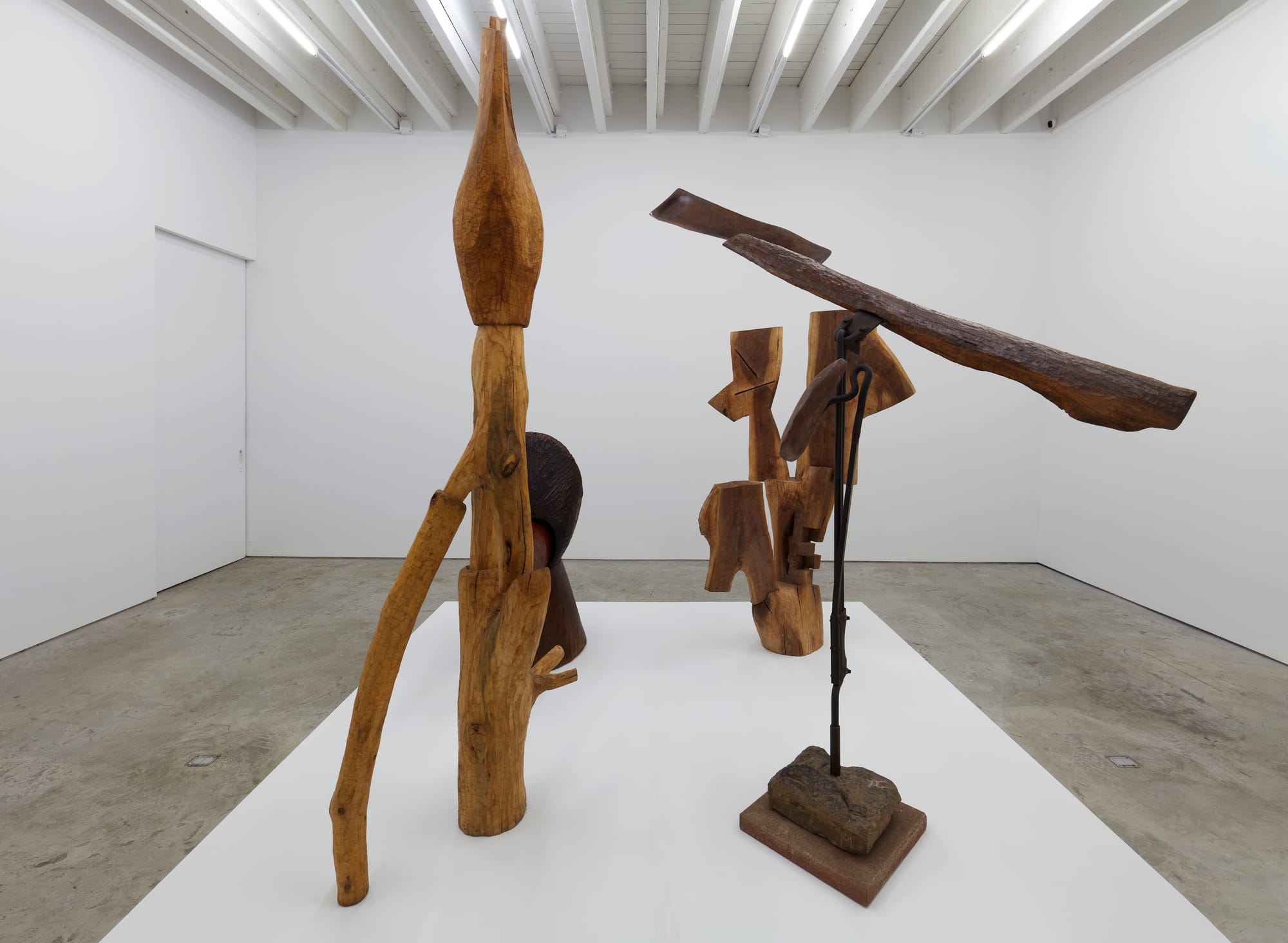 For the freestanding vertical sculptures, which make up the majority of the show, Mosley embraces basic modernist issues, such as the stacking of forms, but he often inserts a sharp, knowing wit. In “Branched Form” (2017), which is nine feet high, he mounts his chiseled version of a bare-branched tree on the crown of a chiseled log. One of the simpler sculptures in this eye-opening exhibition, “Branched Form” has no relatives in the exhibition — not even distant ones.