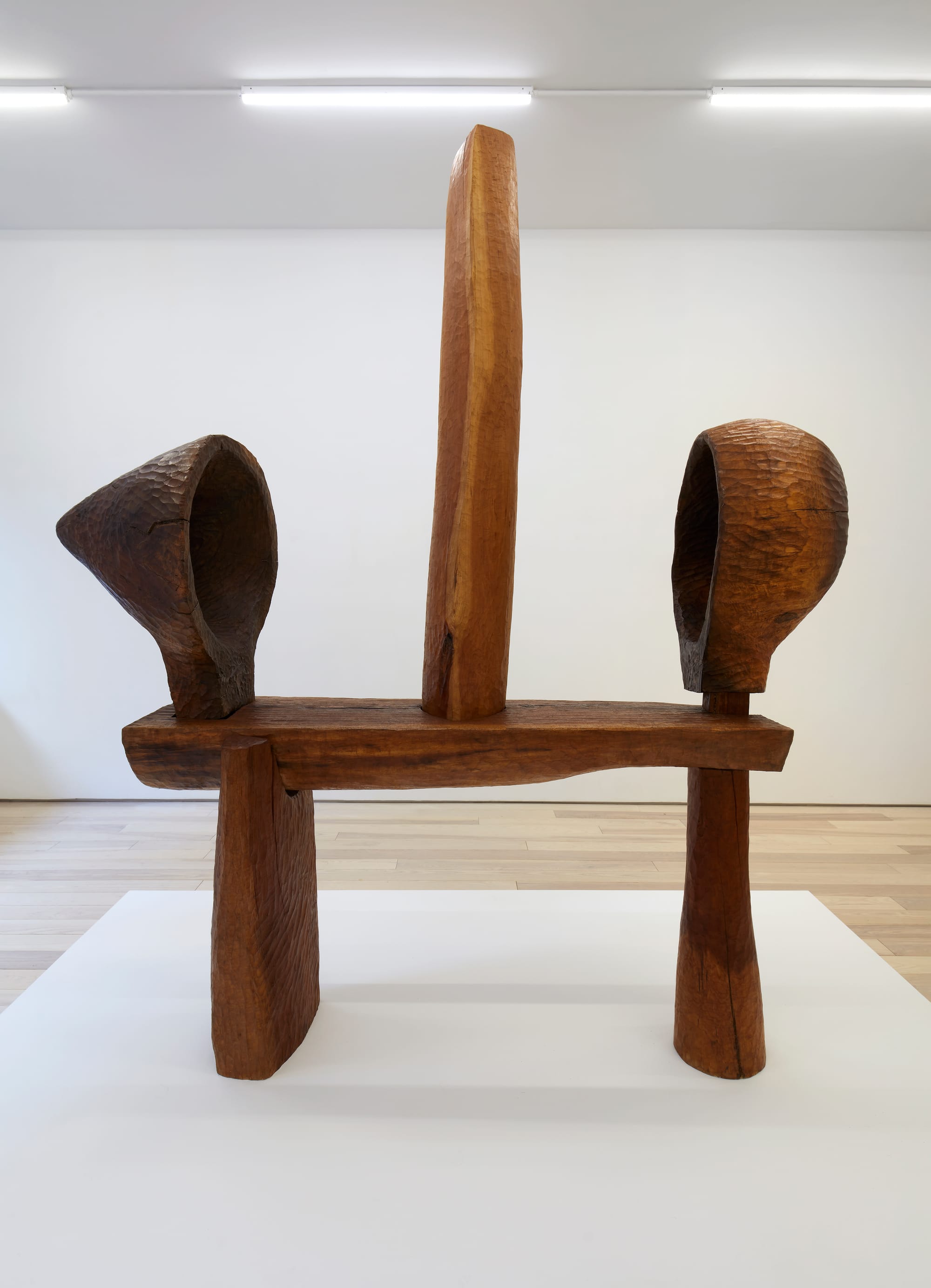 Upon closer inspection, the bench appears to be a log that has been cut length-wise, so that the top is flat and the bottom mostly is rounded. The conical form fits into a hole at one end of the bench, which rests securely in the notch of a thick, slab-like object resting on the floor. At the other end of the bench, the bowl-like form fits onto a tapering cylinder. Both symmetrical and asymmetrical, “Geometric Plateau” is made of six distinct, chiseled pieces that come together.