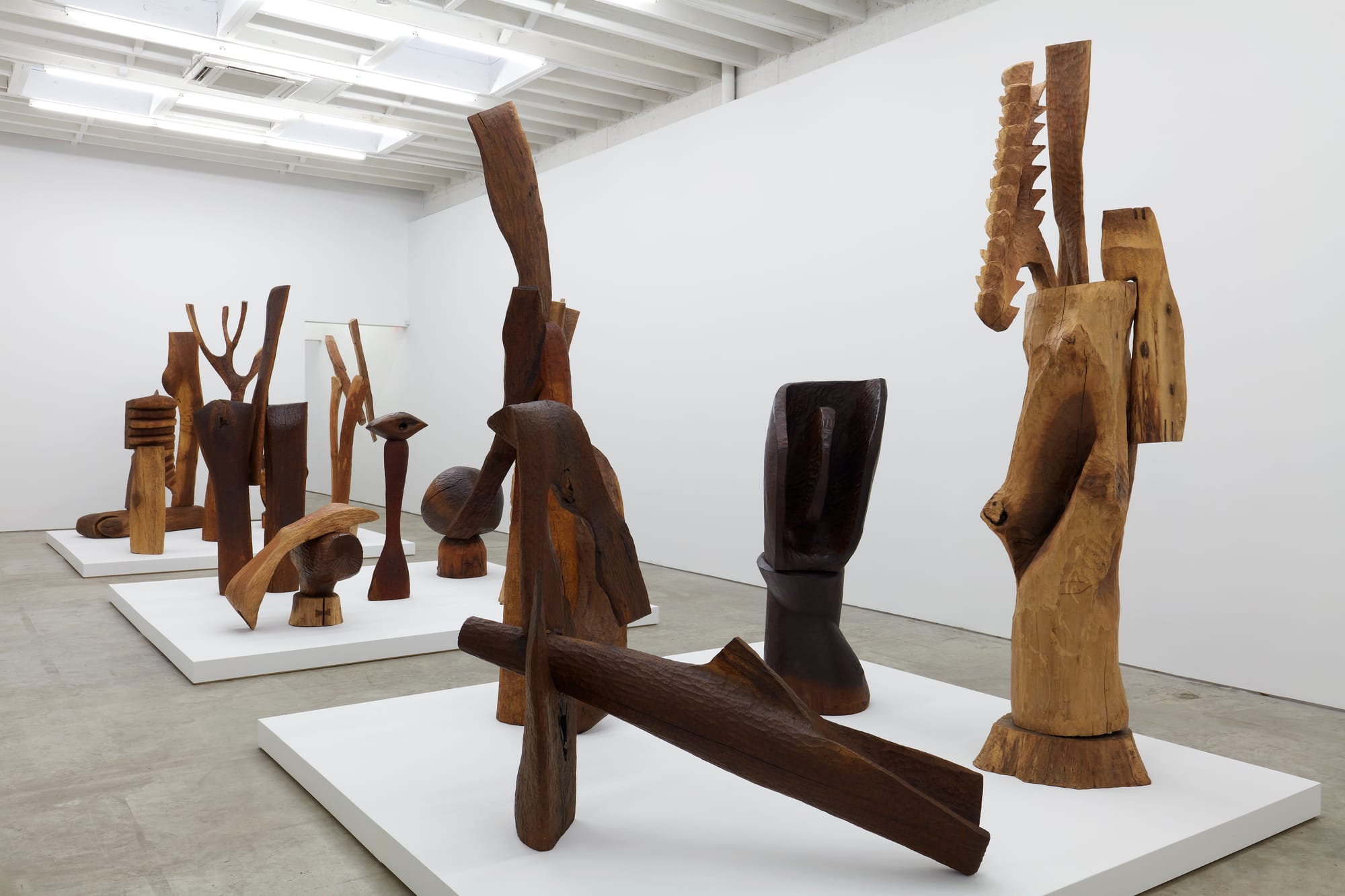 This is Mosley’s genius: Working almost exclusively with salvaged logs and branches, the forms seem to talk to him. He does not impose shapes with his chiseling so much as enhance them. It is striking to see how distinct the sculptures are from each other. In contrast to Constantin Brancusi, Noguchi, and Alberto Giacometti, all of whom have inspired him, Mosley does not make variations on a theme. There is no ideal form for him because no two of his salvaged organic forms are exactly alike.