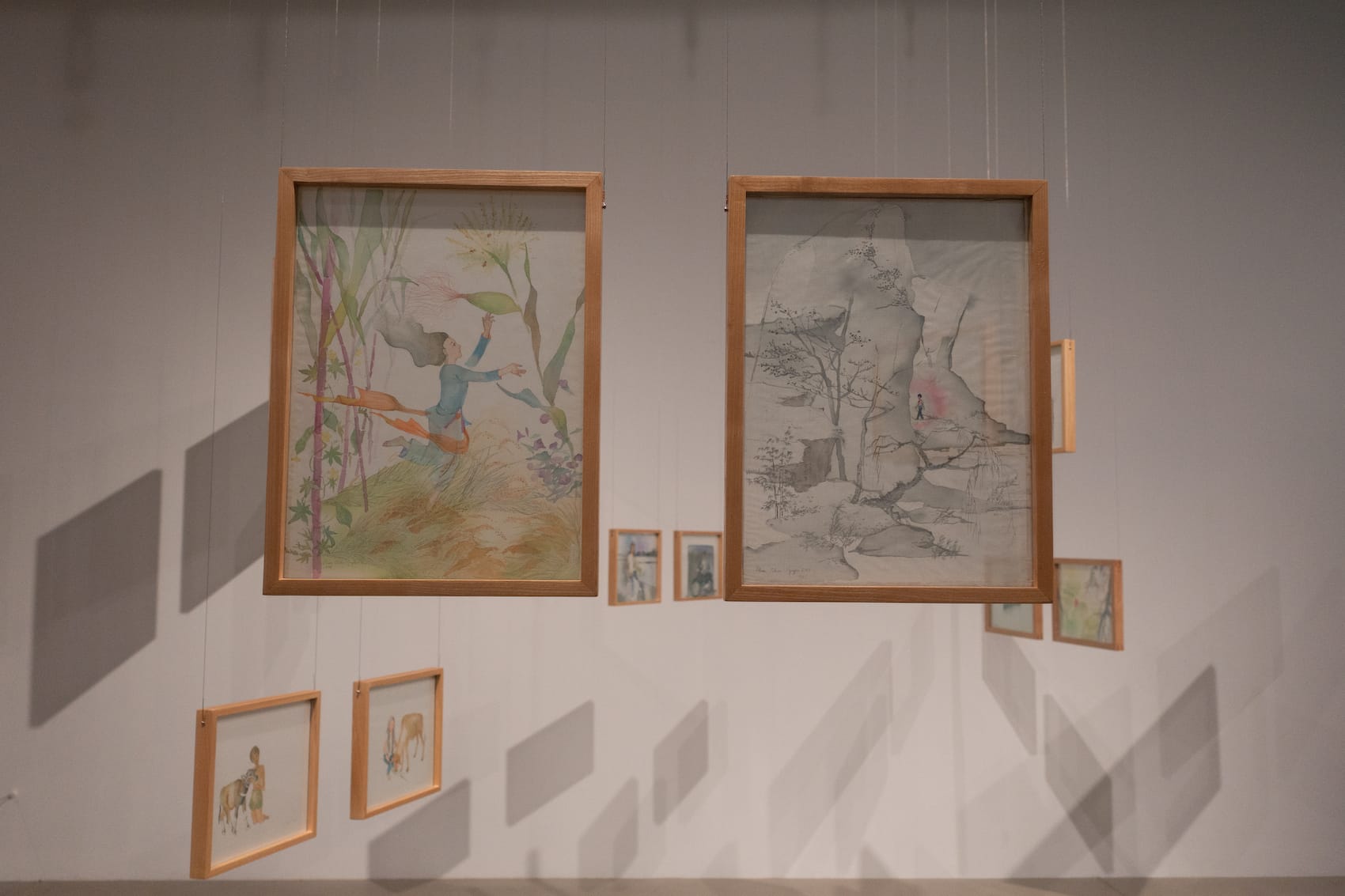 The painting series Dream of March and August (2018-ongoing) serves as an unofficial coda to both films, borrowing "First Rain, Brise Soleil"’s attention to detail and building on the emotional force of "Mute Grain." It portrays fictional siblings, the living March (Ba) and the deceased August (Tám), as they attempt to connect across the beyond. The deft paintings are a lush ode to tropical foliage next to a somber celestial plane, with the youthful faces of March and August reflecting not only grief but also contemplation, consideration, curiosity. They hang together as if in dialogue, engaging in a dance without a defined beginning or end.