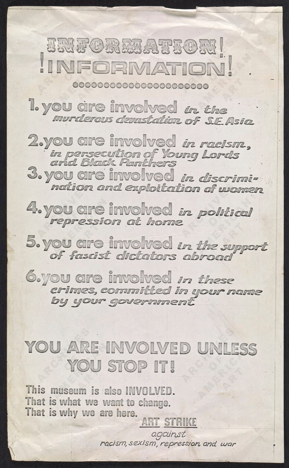Artists embraced a tactic of direct address in 1970 by asking New York City’s art museums and galleries to not only close but also “make available their main floors to the public, free of charge, for information activities against war, racism and repression.” While the artists said that they would be present to engage with visitors and “politicize” them, they insisted that museum directors, staff, and visitors take responsibility for the crisis, as demonstrated by a handbill written by the artists addressed directly to the reader: