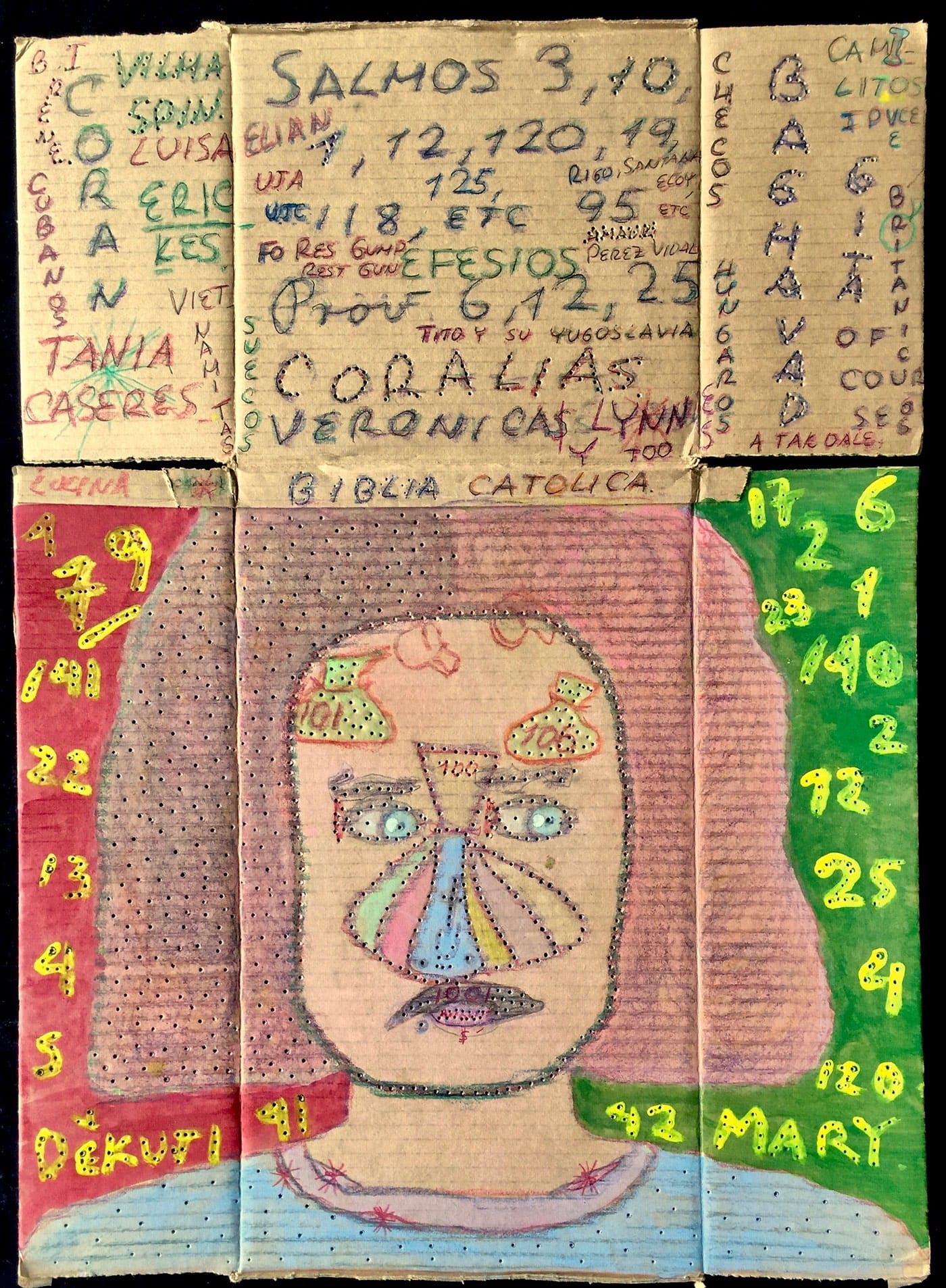 Trained as a mathematician in Cuba and the Czech Republic, “Carlitos” was treated for paranoid schizophrenia back in his homeland following his mother’s death. Now associated with Art Brut Project Cuba, a Havana gallery, he paints, perforates and fills his cardboard surfaces with faces, words, and numbers.