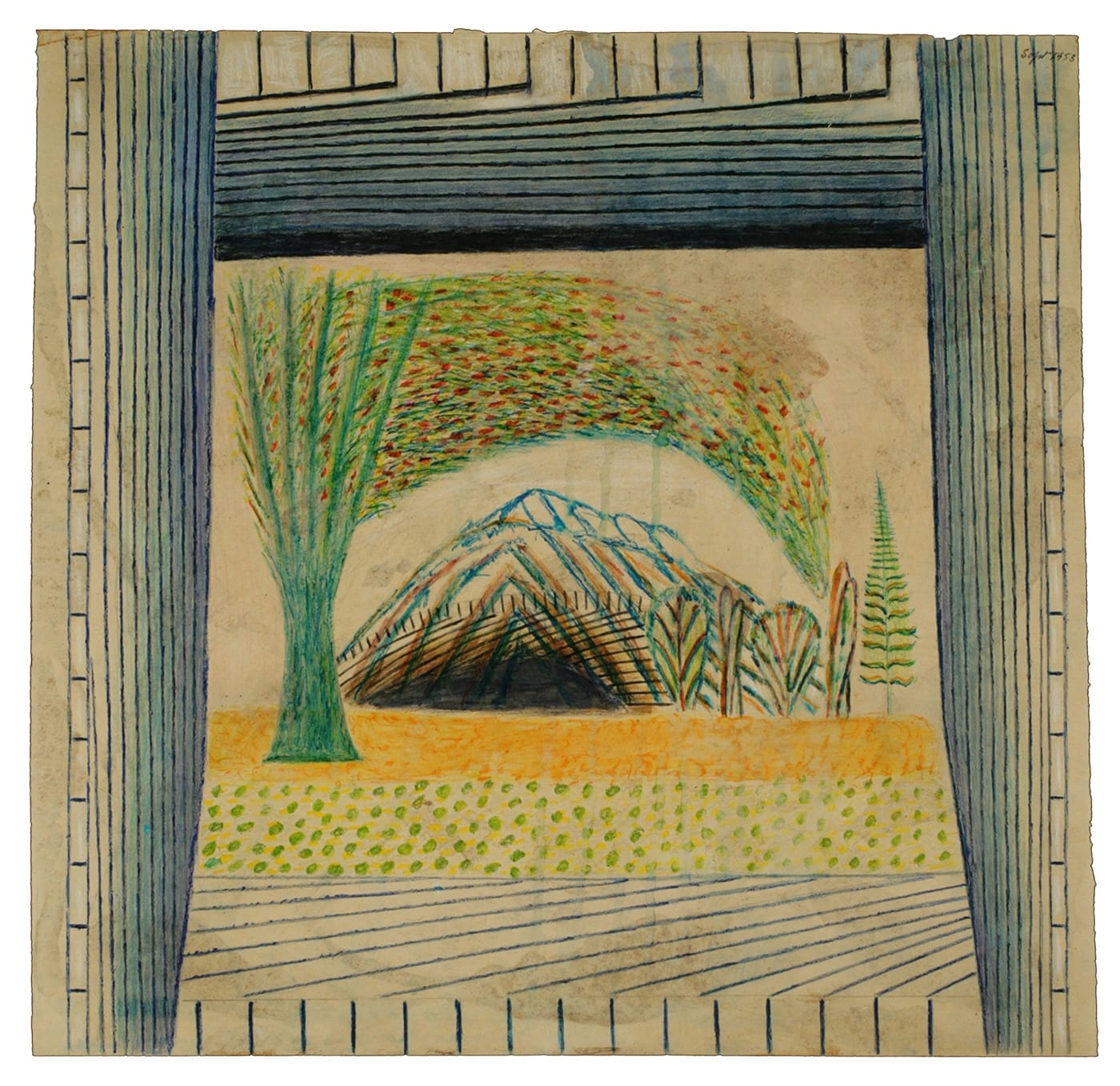 Other superb drawings to watch out for include “Moro Rock and Morrow Bay Near San-Luis Obispo California” (ink and colored pencil on paper, circa 1965), by Joseph E. Yoakum, a favorite artist of the Chicago Imagists of the 1960s-70s (Carl Hammer Gallery, Chicago), and, from New York’s Ricco/Maresca Gallery, a recently surfaced, rare work from Martín Ramírez, “Untitled (Landscape with Arched Tree)” (graphite, tempera, and crayon on paper, 1953), in which the Mexican-born artist used one of his familiar, proscenium-like forms to frame a patch of a verdant, almost Hockneyesque landscape.