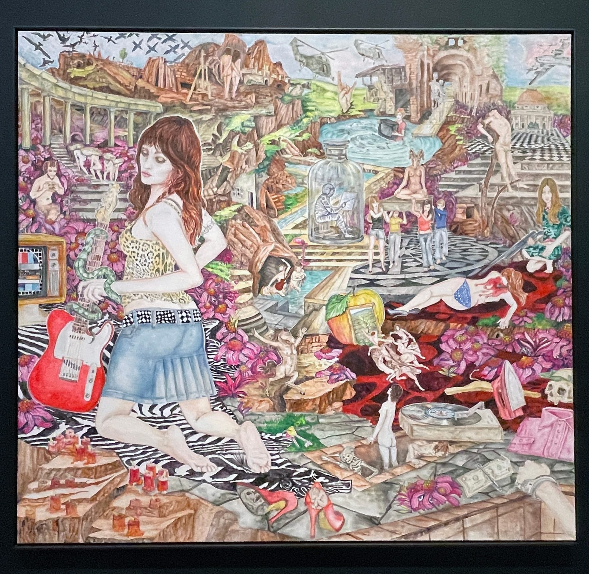 The most conceptual takes appear in the Orange County Young Curators mini exhibition, Piece of Me, which explores authenticity in the digital age. Though the curators had to work with OCMA’s permanent collection, they could still get into a teen’s mind. A dazzling painting by Abetz & Drescher, “Long Before Rock ‘n’ Roll” (2006), shows a young woman with an electric guitar posing amid a surrealist archeological site, surrounded by vignettes of sin and suffering. It’s both the trauma that has shaped her and the inner turmoil in her angsty mind. Another photographic series, Ed Templeton’s Teenage Smokers (1999), touches upon the performative acts teenagers engage in to appear cool. A modern take on this series wouldn’t even need to reshoot it with vapes, because Gen Z brought smoking back into style.