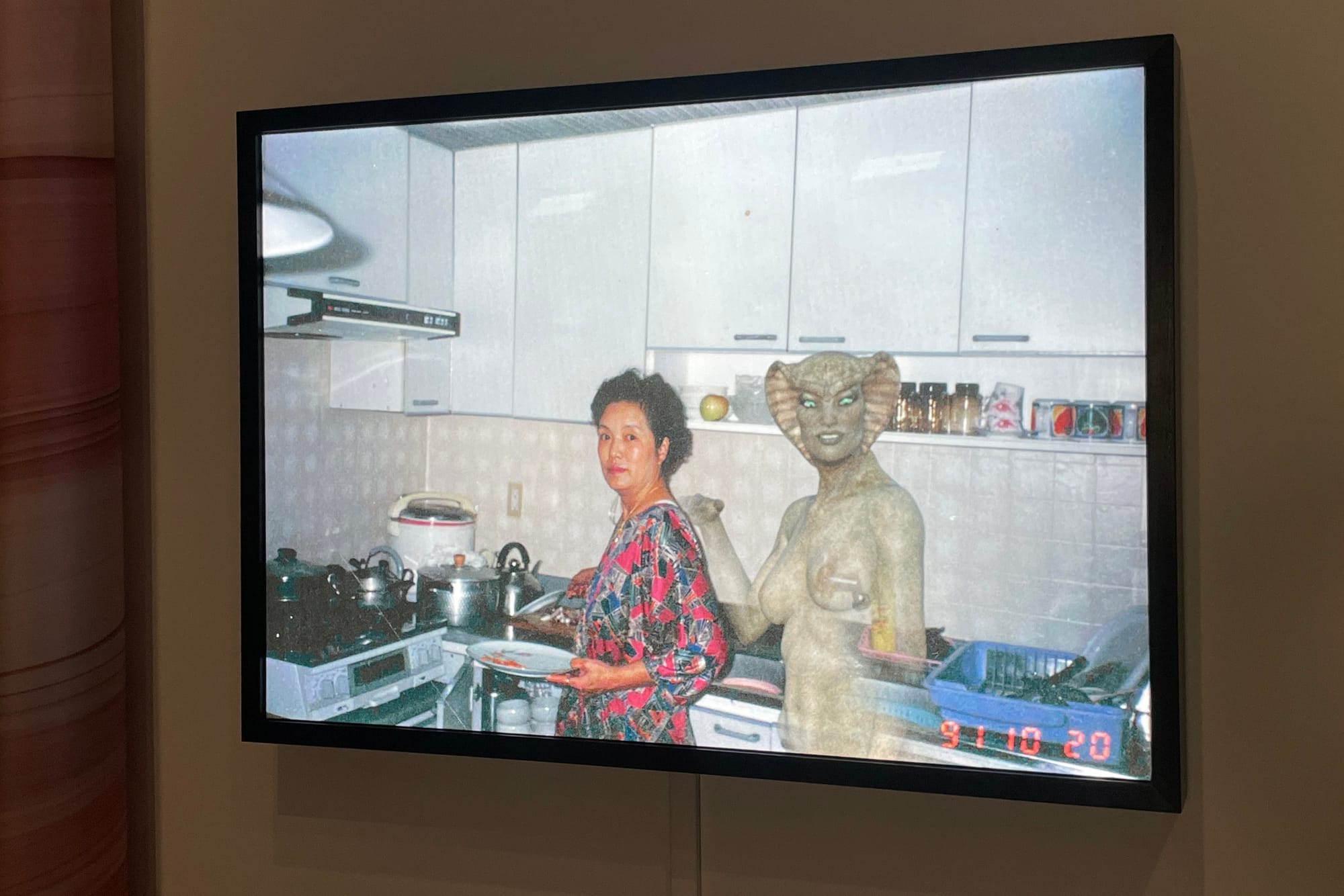 Another intriguing entry is Heesoo Kwon’s photographic installations, which enhance childhood photographs by adding matriarchal aliens and AI-generated edits. Kwon enlarges old photographs of family moments in the kitchen or living room, sometimes stretching them to the full height of the gallery walls. The edges of these photos warp into an uncanny perspective and eventually blur into blackness, which is the work of Adobe Firefly, an AI software.