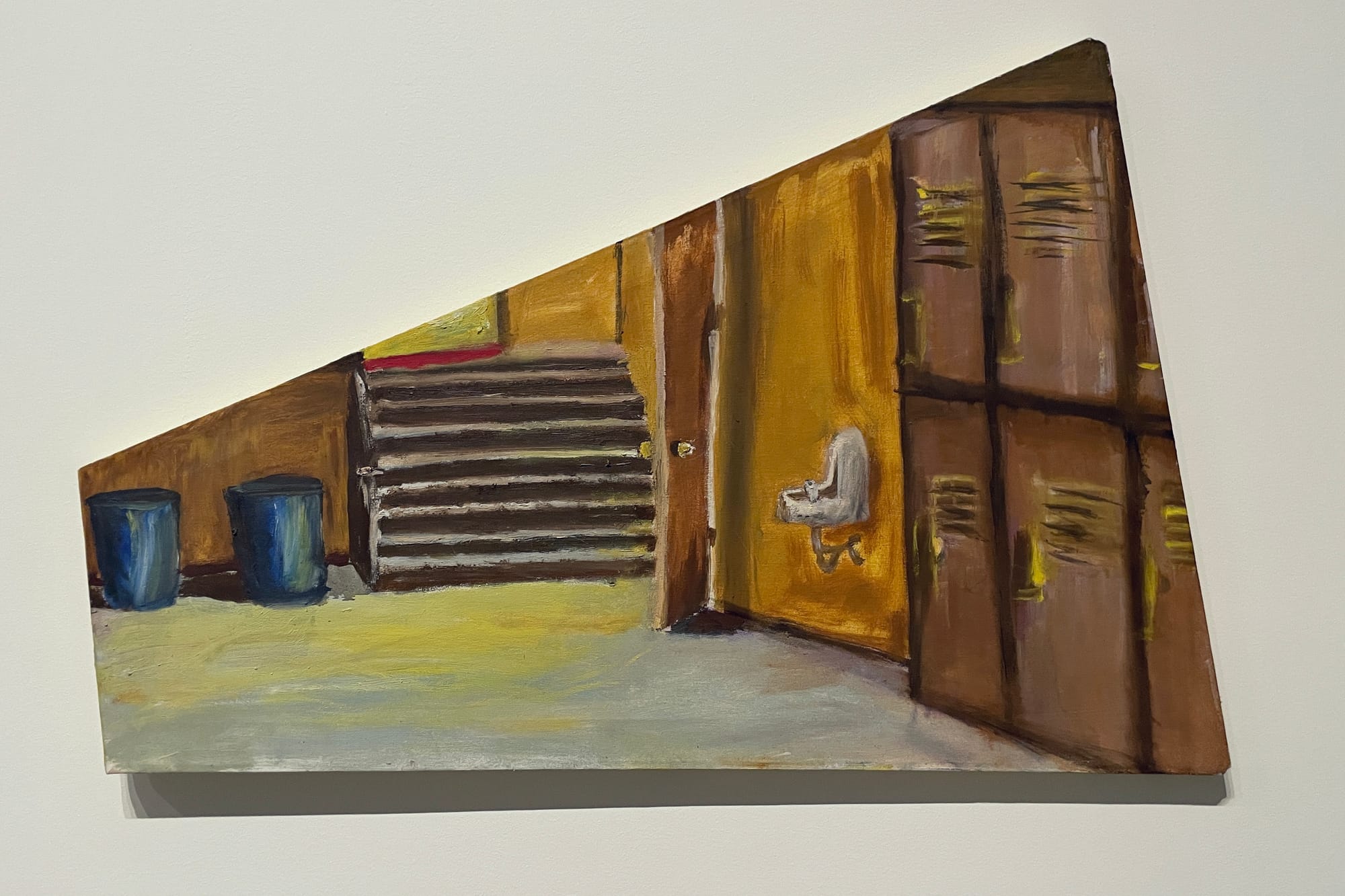 Owen’s, “Untitled” (1987), made when she was a teenager, is an awkward composition of school lockers, stairs, and trash cans, stretched onto a trapezoidal canvas. The work itself doesn’t inspire deep thoughts, but its existence got me to ruminate on the childhood home my parents sold in 2018, when they finally decided to divorce. My dad was ruthless about downsizing and wanted to throw away all my drawings from high school. I had to justify their sentimental value, and rescued a few of them. Those drawings, as well as my entire childhood, were crammed into a single plastic tote that lives in my dad’s garage in Chicago.