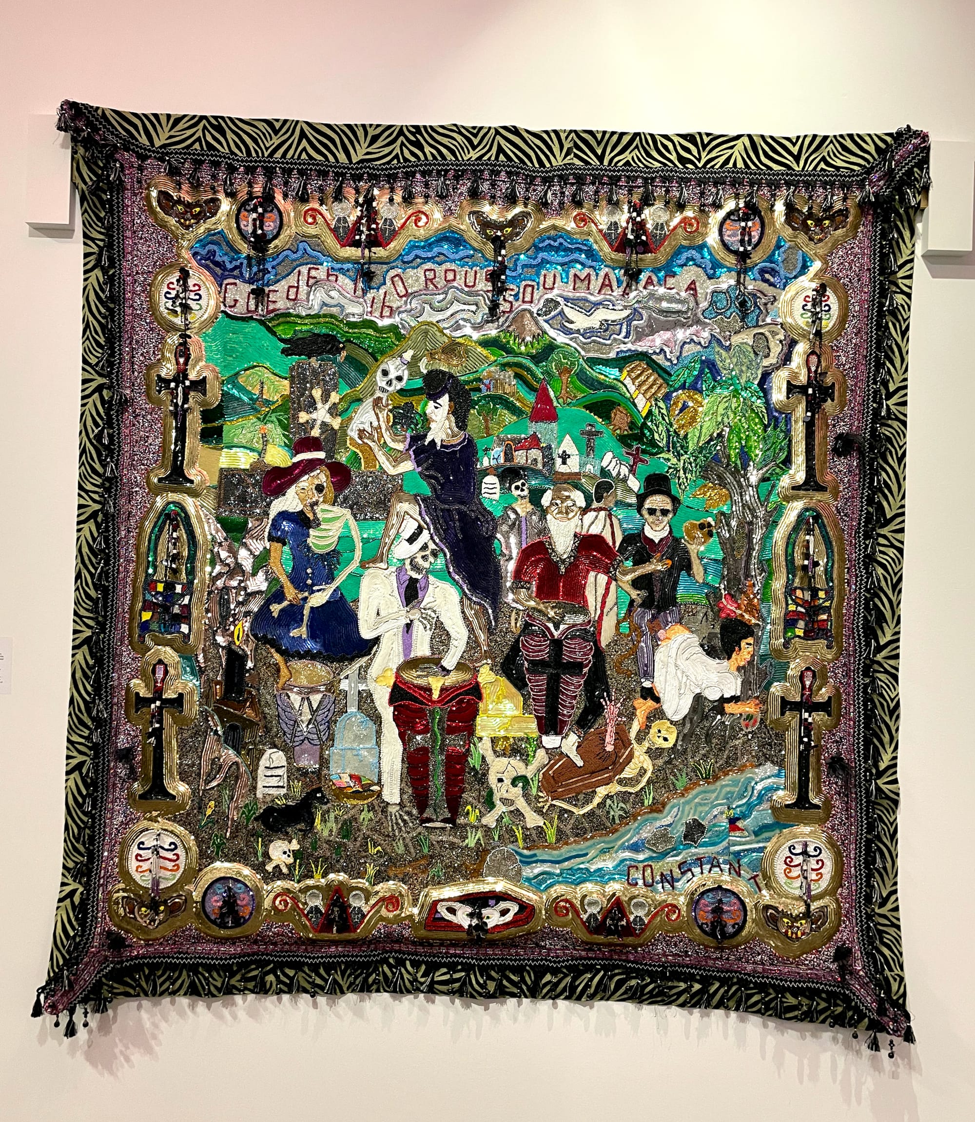 Another maximalist work, Constant’s tapestry “GUEDE (Baron)" (2020) revisits recurring themes in the artist’s oeuvre. The title refers to the guede, the family of spirits in Haitian Voodoo associated with ancestor worship. Incorporating both spiritual and everyday iconography, the drapo (ritual banner) collapses death, the afterlife, and the future in its complex imagery.