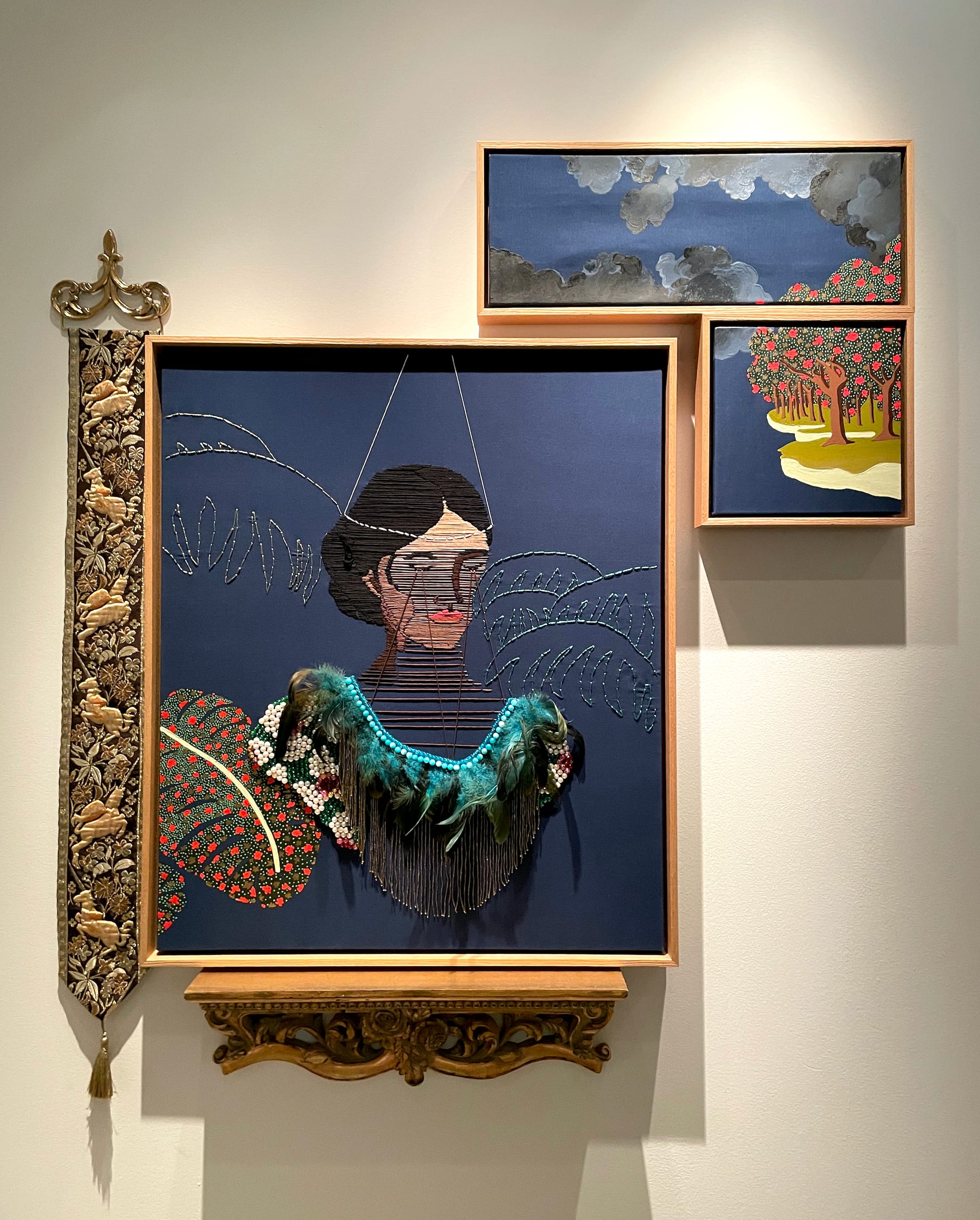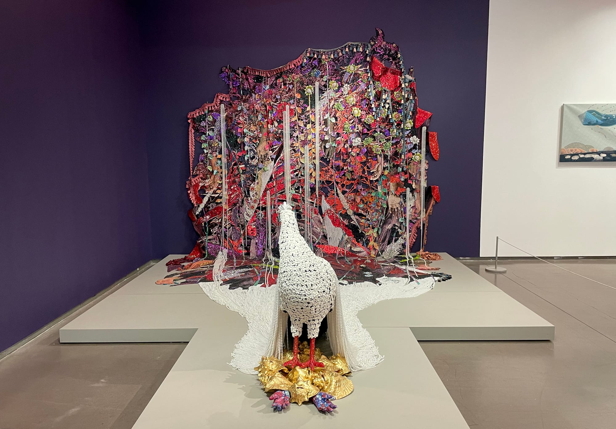 Concurrently, the location’s temporary exhibition, Revival: Digging Into Yesterday, Planting Tomorrow, on view through September, is a thoughtful meditation on the relationship between the past and present, featuring artworks by Isaac Julien, Ebony G. Patterson, and Myrlande Constant, among others. Patterson’s installation “When the Land is in Plumage…” (2020) is a showstopper: a sculpture of a peacock covered in white flowers stands atop gold conch shells; strands of pearls trail behind it like the train of a wedding gown, connecting it to a multicolored, bejeweled tapestry on the wall. The stunning work evokes a fantastical garden, commenting on the role of the human hand in shaping nature and, subsequently, overtaking the natural world.