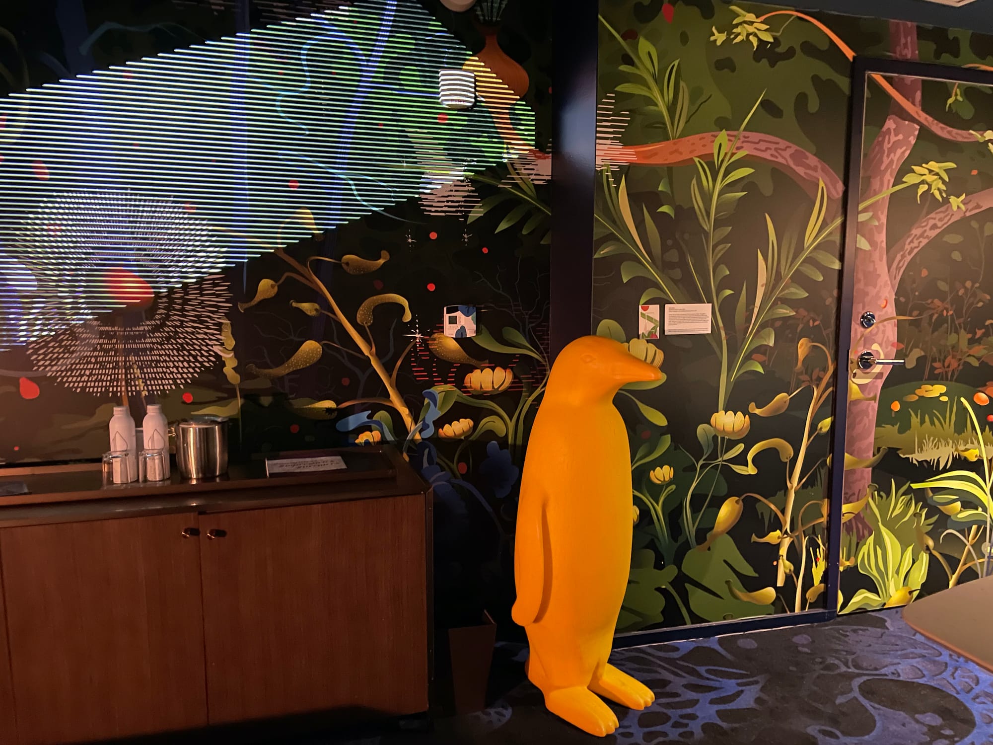 A recent visit to the Cincinnati location was on par with a gallery or museum. Multiple rooms in the hotel are designed by artists, almost like staying in an immersive installation. Most recently, they’ve added the “Nightwatch Artist Suite,” created by artist Chris Doyle. The installation includes biomorphic images of trees, plants, and flowers printed on the walls, floor, and curtains and a searchlight projection that moves across the walls that cultivate an encompassing environment with a focus on the natural world. The hotel describes it as “equal parts Renaissance still life and Disney’s Fantasia,” but to me, Doyle’s design also evokes a jungle at night filtered through a lens of surrealism, accented by a large penguin sculpture by art collective Cracking Art. The “Nightwatch” video is part of a body of work by the animation artist. Each stay in the room also support’s Cincinnati’s art community, with a donation by 21c to ArtsWave, a local art nonprofit in the city.