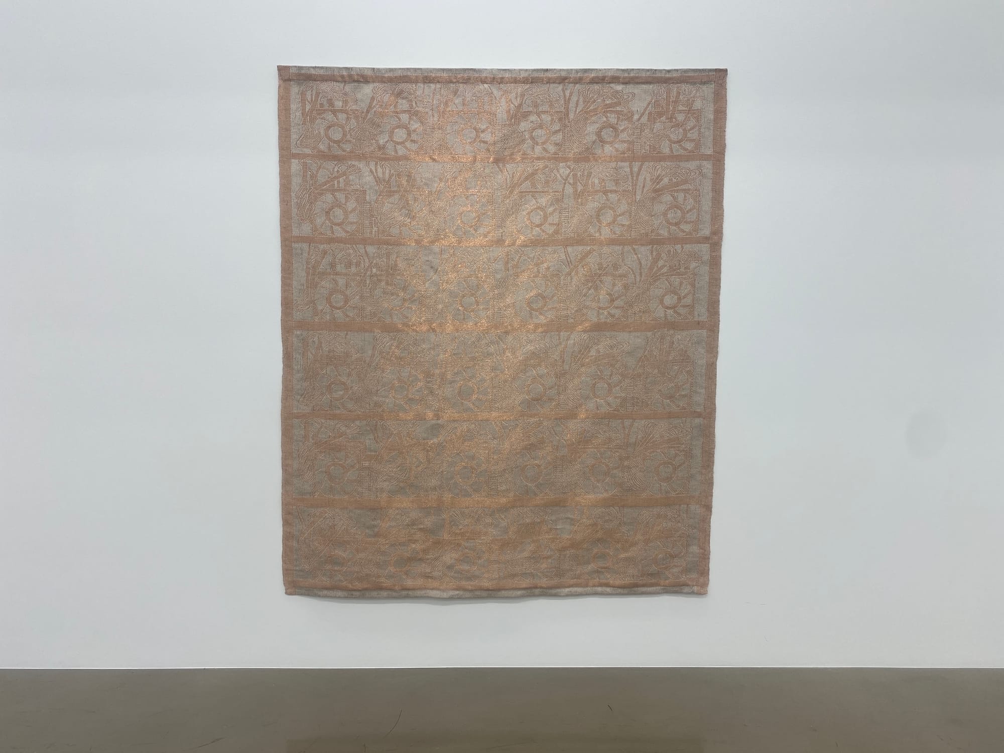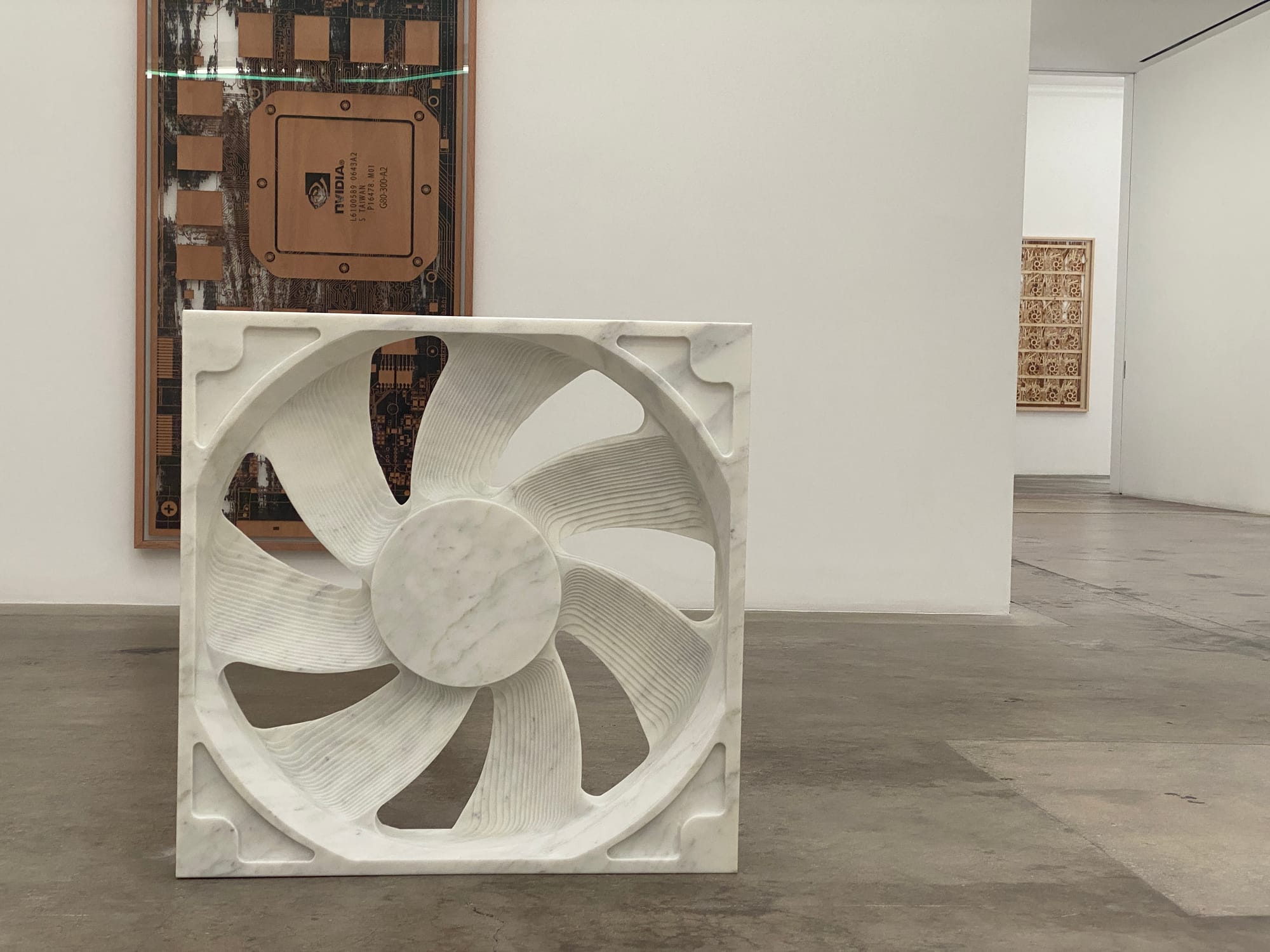 Fans carved from marble slabs appear throughout the show, sprinkled with gravitas that belies the humor of crafting mundane objects in marble. Upon close inspection, we see an apparent typo in the inscription on them — “rotaion” — that is actually on the original fan Saban sourced for the sculptures. The work “functions as a lighthearted trace of globalized trade and miscommunication,” notes the exhibition text. The pieces pair well with a series of tapestries depicting computer fans, displayed as racks of various fans with wires weaving in and out of them.