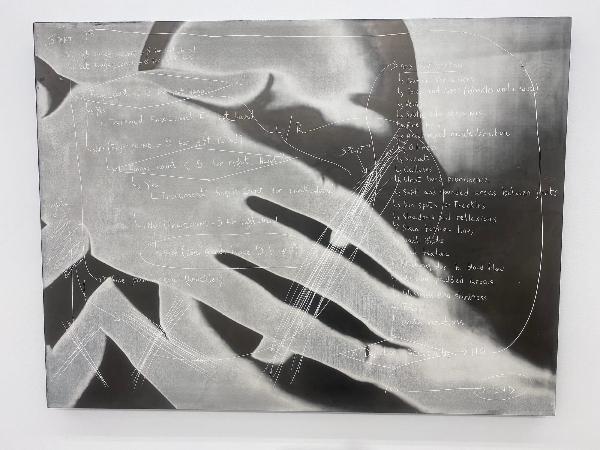 In “Flow Chart (Prompt Drawing: Right Hand / Left Hand),” the instructions are more elaborate, with a series of variables that allow us to “Add Skin Mapping.” The algorithm is asked to note qualities like “fine hair,” “subtle color variations,” and “nail texture.” If the depiction is accurate — and we’re never given a definition — we can end the drawing: