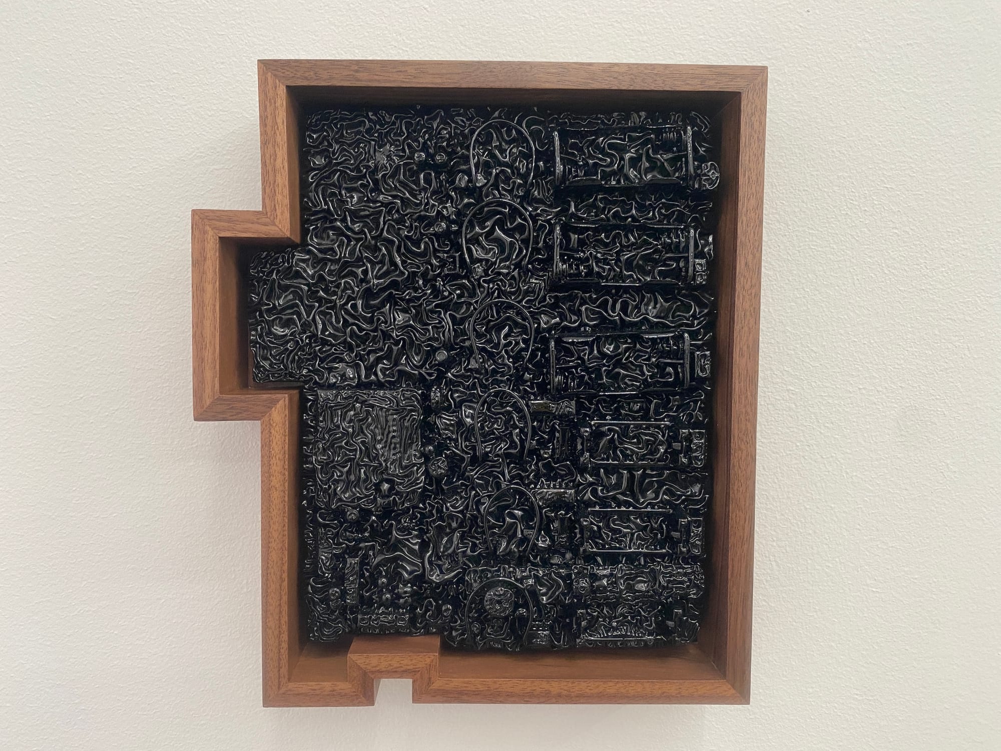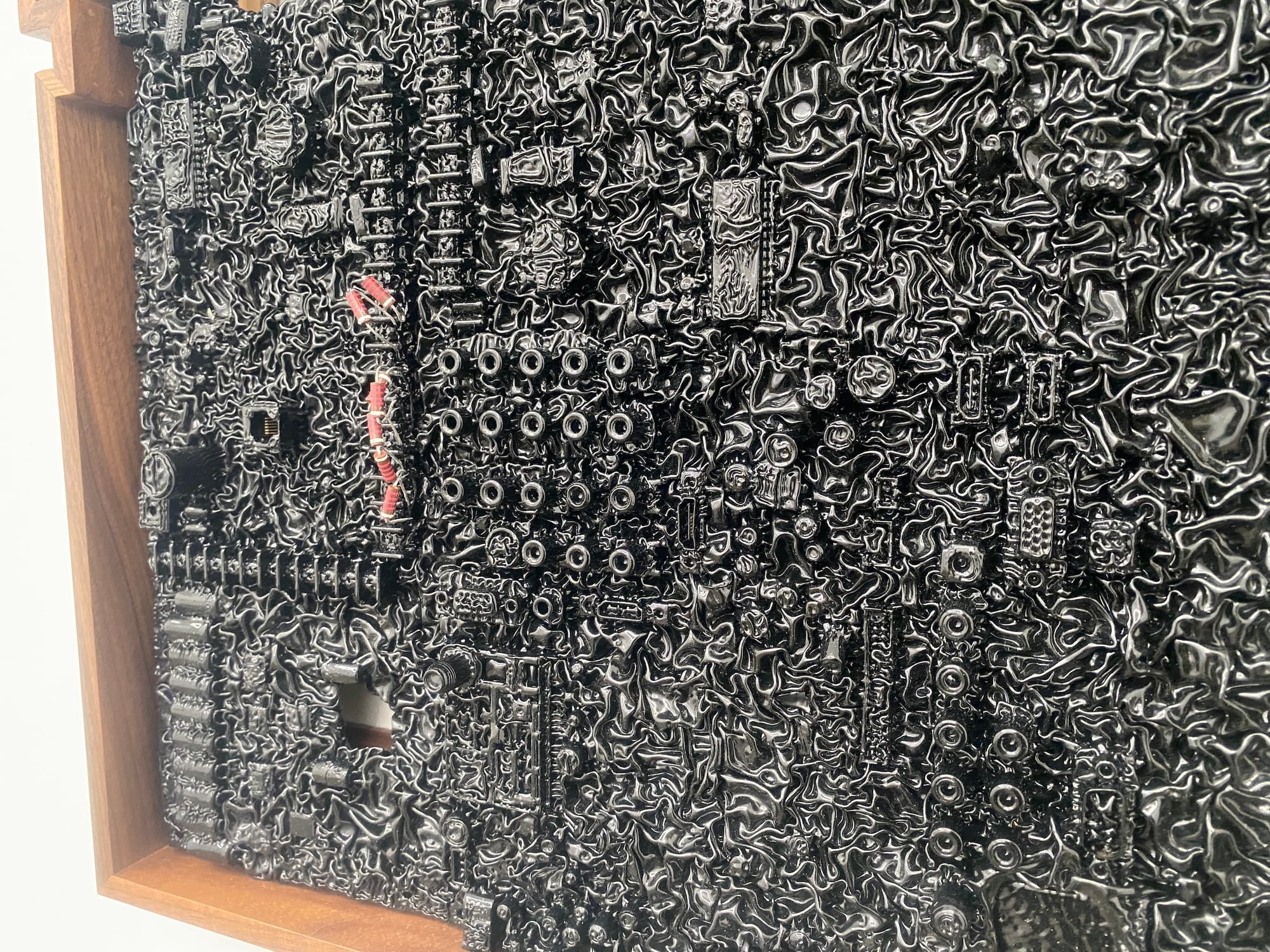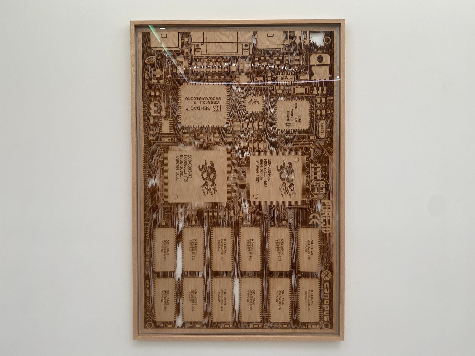 Some of the most gorgeous works are in the Motherboard series, which features actual computer motherboards that Saban has covered in printer’s ink and mounted on walnut frames. Similarly, the artist renders microchips in laser cut oak, making them larger than life to help us dive in, visually, and weave through all the intricate lines and interconnections of objects. These detailed views reveal the maze-like quality of the hardware that makes our digital world possible.