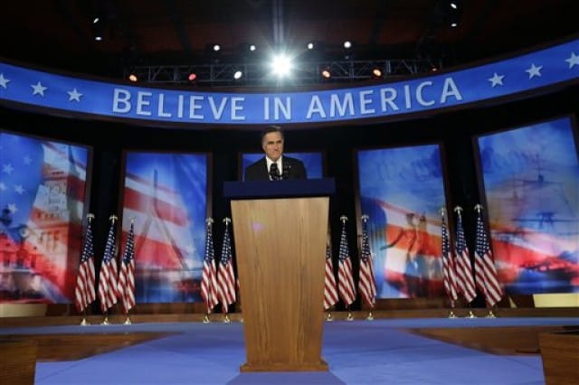 As election night unfolded I was taken by the two candidates’ backdrops for their speeches. Both were so chalk full of over zealous American patriotism that it hurt to look at. It was especially surreal to watch Romney’s concession speech (above) in Boston in front of his pro-American background equipped with 12 flags, the constitution, ships, monuments, and of course, “Believe in America,” whatever that even means.