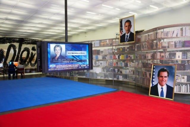 Maybe because it is incredibly hard to sidestep outright advertising, or over zealous protest work, museums have often avoided political work. However, this election year several museums showed Jonathan Horowitz’s “Your Land/My Land: Election ’12” (2102), which served as a critical platform to discuss the overly aestheticized debates. The installation was built in keeping with the obvious dichotomies of the election that hinder a bipartisan discourse. Viewers could watch the debates and join in discussions about the election process as a whole, choosing to sit on the red or blue side, on the Fox News or the MSNBC side. Although I didn’t get a chance to experience this installation in any of the seven museums around the country that it was simultaneously being shown in, I am excited by it’s emergence.