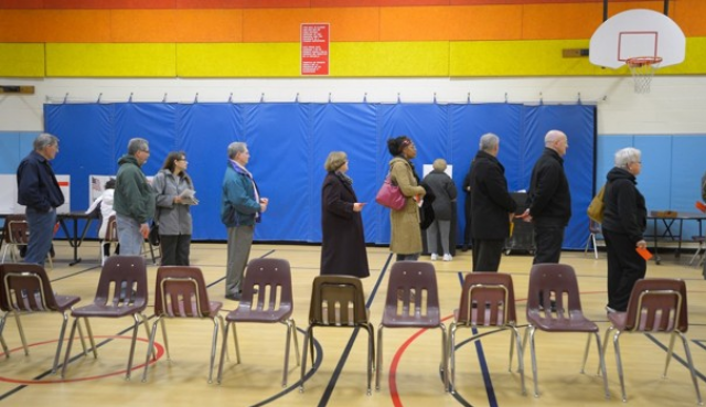 Unfortunately the real aesthetics of democracy, although made to be so glamorous and heroic in the campaign ads, are rather dull. While Horowitz’s installation begins to tear down the hollow juxtapositions that the two parties attempt to build up, Horowitz doesn’t offer us any new way of looking at the parties. When it comes down to election day, the prideful position of a citizen voter is put to the test in a way few election ads hints at: long lines in rather unimpressive locales like local churches and public school gymnasiums. The Washington Post had a great online series of election day photographs (like the one by John McDonnell above) that drove this idea home.