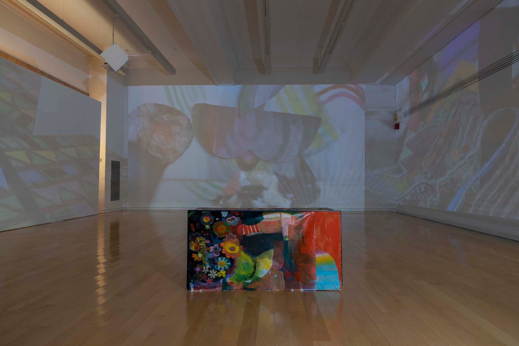 Repurposing is probably not a Chicago thing, though, if I’m being art historically honest. It appears to be a fundamental instinct of makers everywhere and always, from the Gee’s Bend Quilters to Robert Rauschenberg, from your kindergarten teacher to the builders of the Arch of Constantine, who incorporated spolia, fragments of earlier structures, a practice common in late antiquity. Local or not, I’ll take collage where I can find it, and right now the ground floor of the Chicago Cultural Center is where it’s at. Currently on view in an edifice that once served as the city’s central public library is the exhibition An Instrument in the Shape of a Woman. Named after a line in “Planetarium,” a poem by Adrienne Rich celebrating the 18th-century astronomer Caroline Herschel, the show features three mid-career Chicago artists, all creators of resolutely handmade, riotously colored abstractions that sometimes find their way into deceptively charming stop-motion animations. For reasons practical, ethical, aesthetic, and otherwise, they all also continually repurpose their own and others’ creations into new artworks.