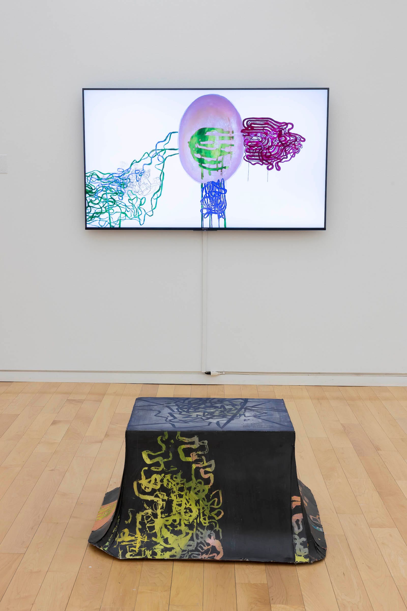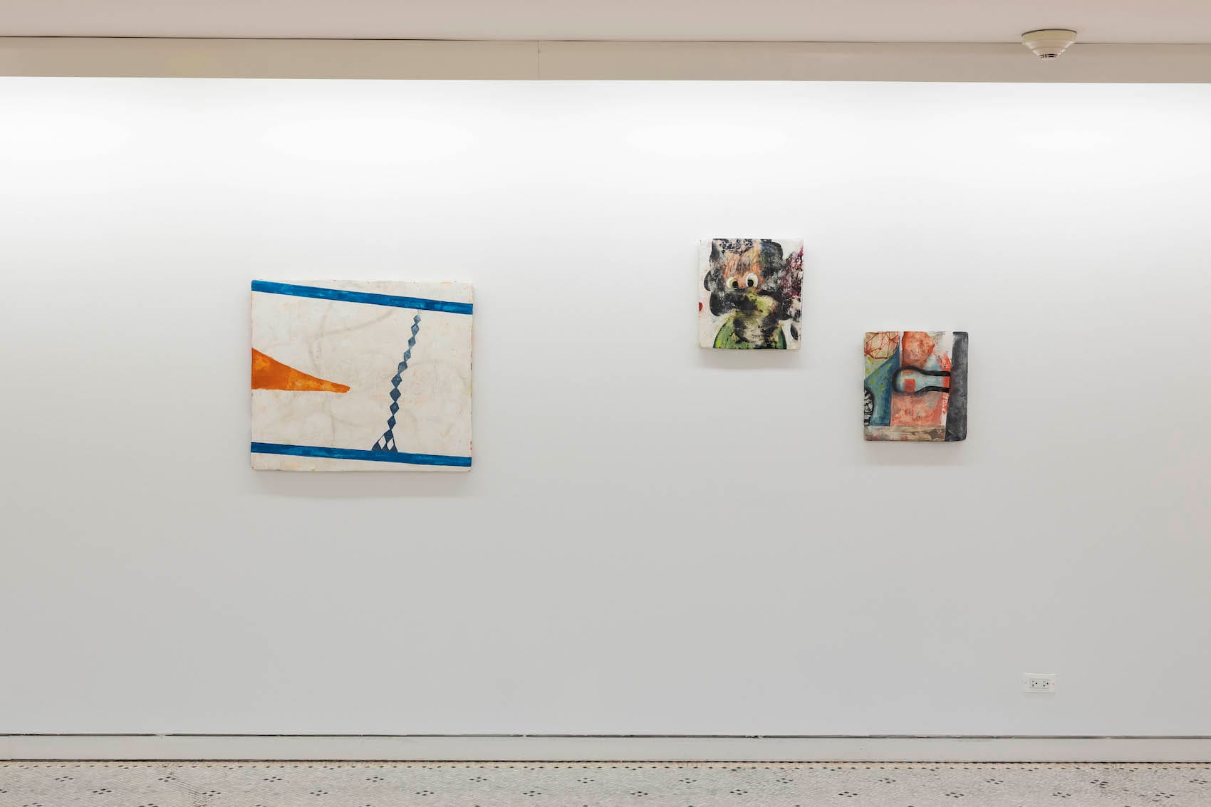 A Buddhist might call these successions of creation and reuse by the name samsara, the cycle of death and rebirth to which they believe life in the material world is bound. Diane Christiansen, the third artist in the exhibition and a “forever student of Buddhism,” suggests as much in some of her stop-motion animations and paintings, as well as in a bench molded from layers and layers of old animation drawings. Sit on that and watch what they once were, in videos equal parts fierce and funny, darkness and light. These are toons where nothing ever stays one thing for long: in “Speck,” radiant blobs become a planet, sprout spindly utility poles that morph into chomping alligator maws, go gray and flat and brushy, then host a farm that turns into a giant, teary-eyed toad, which belches a galaxy of rainbow splotches. (There’s a walking vagina hand, too, but it’s an independent character.) Likewise Christiansen’s small paintings on plaster, with their patina of erasure and reworking, repair and graffiti, their feel of being fragments of frescos or tiled flooring. The plasterworks sometimes also serve as animation imagery, and one has even found itself inset into a large, blazing red painting on paper titled “Last Days of Capitalism.” After so much repurposing and continuation, it seems the end is nigh. Have we finally reached nirvana? If only!