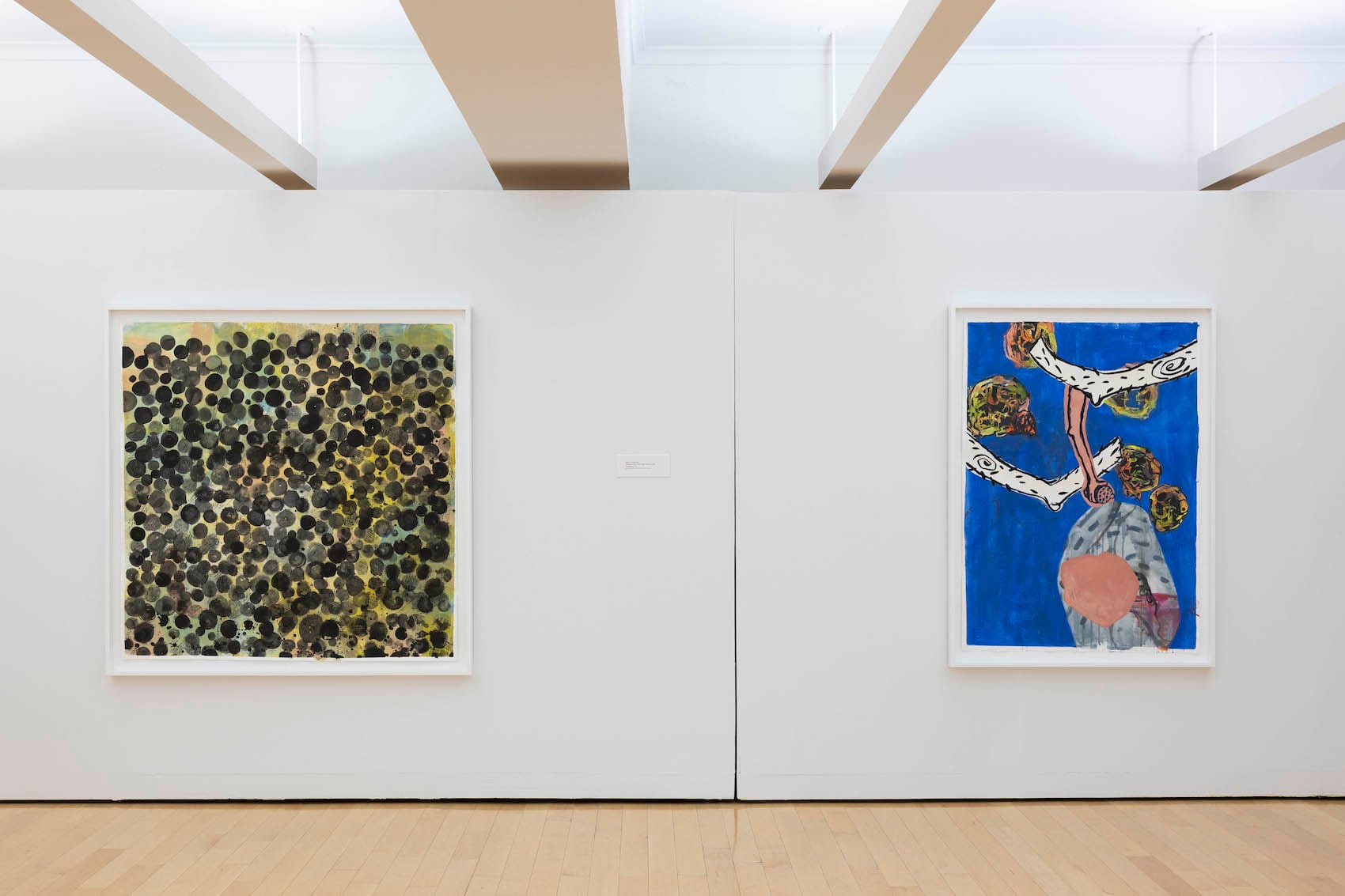 Let’s begin with Selina Trepp, who provides a free zine diagramming the reasons for her decision to stop bringing any new materials into the studio 10 years ago. This principle has had enviable effects: less money spent, more time gained, aesthetic adjustments, learning new things, less work-related anxiety, and ultimately a happier life. How it looks is inexhaustibly delightful and a wee bit mischievous. There’s a series of “Dirty Drawings,” mysterious and surprisingly vivid palimpsests created by leaving old drawings on the floor until they have been altered enough by being walked on, then adding a little more. “Utility Piece,” a large diamond of Cinefoil covered in irregular patterns of tape, foil, and paint, has been around since 2015 to fix awkward installation situations like an inconvenient shelf or, here, a big blank wall.