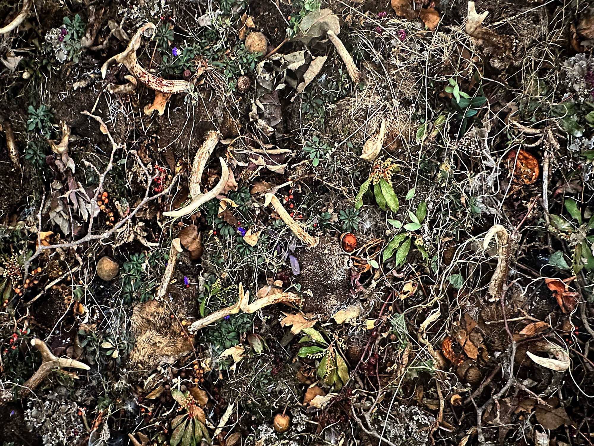 Consisting of a mostly brown and yellow palette, “Woven N° 17” (2016) stands out for its profusion of deer antlers that jut out at every conceivable angle, some stained with blood. These photographs lend themselves to both macro and micro inspection. From six feet away, the antlers resemble so many mushrooms, or a burial ground of phalluses. Upon a second inspection, I was startled to realize that these weren’t just deer antlers — I had entirely missed that they were still attached to the heads! Feeling compelled to count them, each time I came up with a different number: 28, 29, 31? Finding order in Marcuse’s natural labyrinths proved a futile task, reflecting nature's inscrutable internal order.