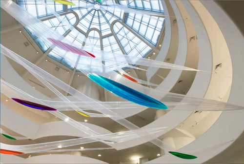 The current Guggenheim exhibition contains 145 works by 25 artists and begins in the museum’s rotunda with a luscious sculptural installation by the late Motonaga Sadamasa titled “Work (Water),” which employs long, thin, clear industrial plastic tubes weighted by colored water and suspended from the coiling inner spirals of the museum’s walkway.