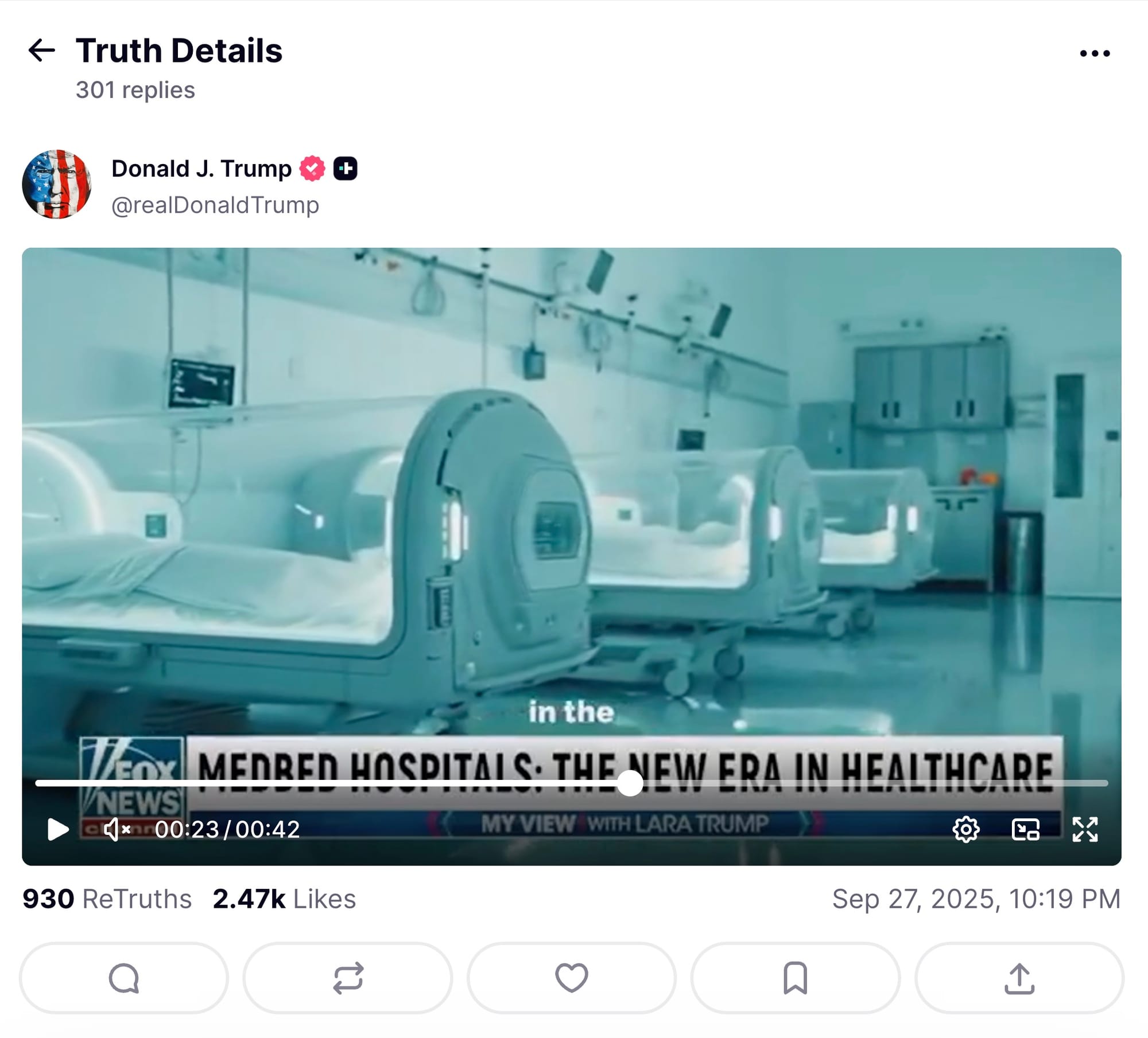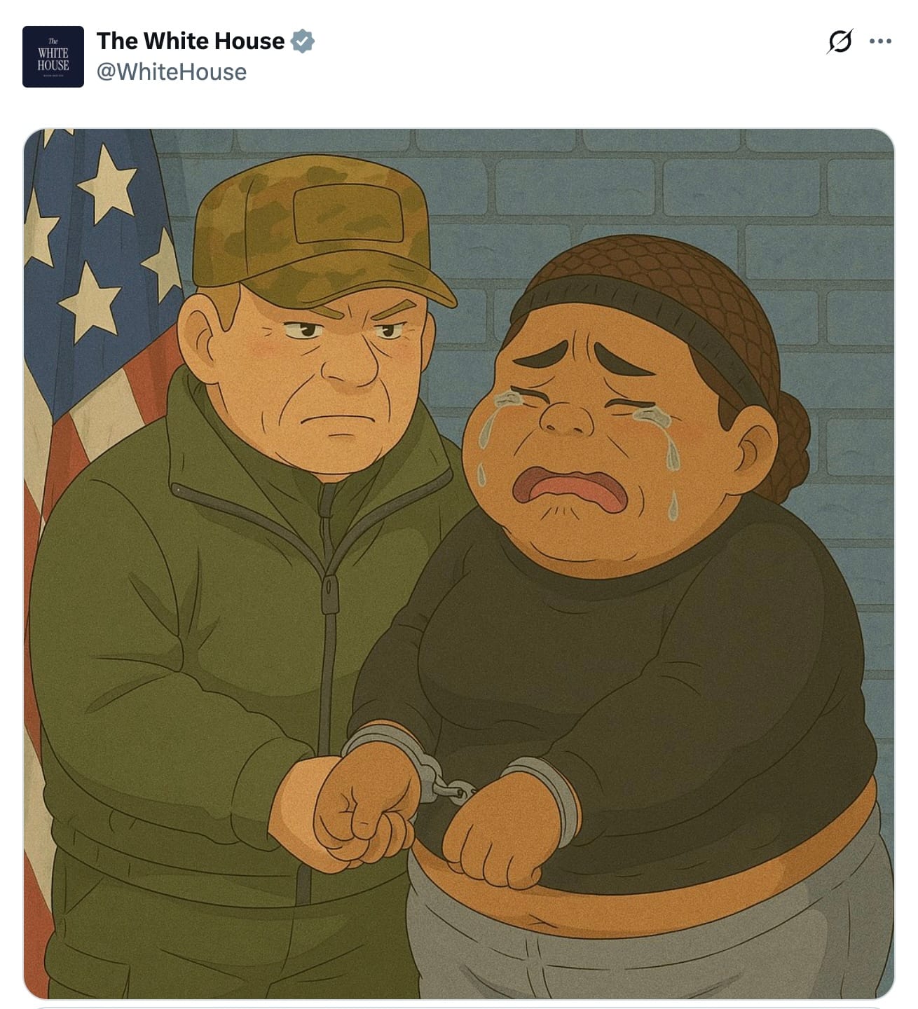 Meme logic is less a departure from traditional fascist aesthetics than its logical conclusion. While Walter Benjamin argues that “Mankind in the time of Homer” was “a spectacle for the Olympian gods,” it has now “become one for itself.” And so fascist discourse, which is based in the aestheticization of politics, continually updates itself to the medium of a given age. Just as nearly a century ago fascists deployed radio and film, so do their ideological descendants use memes, social media, and above all, artificial intelligence. Where Mussolini broadcast Ezra Pound and Adolf Hitler championed the filmmaker Leni Riefenstahl, Trump relies on the impersonal power of the algorithm. Since the now positively archaic days of bot farms and Cambridge Analytica, Trump has graduated to more sophisticated digital manipulation predicated on the surreal nightmare logic of AI slop. Images of cruelty proliferate, such as the official White House X feed sharing a Studio Ghibli-style cartoon depicting the arrest of a crying immigrant; a recent meme that declared the Democrats “THE PARTY OF HATE, EVIL, AND SATAN”; or the AI-generated video promulgating the conspiracy theory that there are so-called “med-beds” capable of reversing illness — a form of sadism seemingly directed to his own supporters in that it makes promises to those who are desperate and believe his lies.